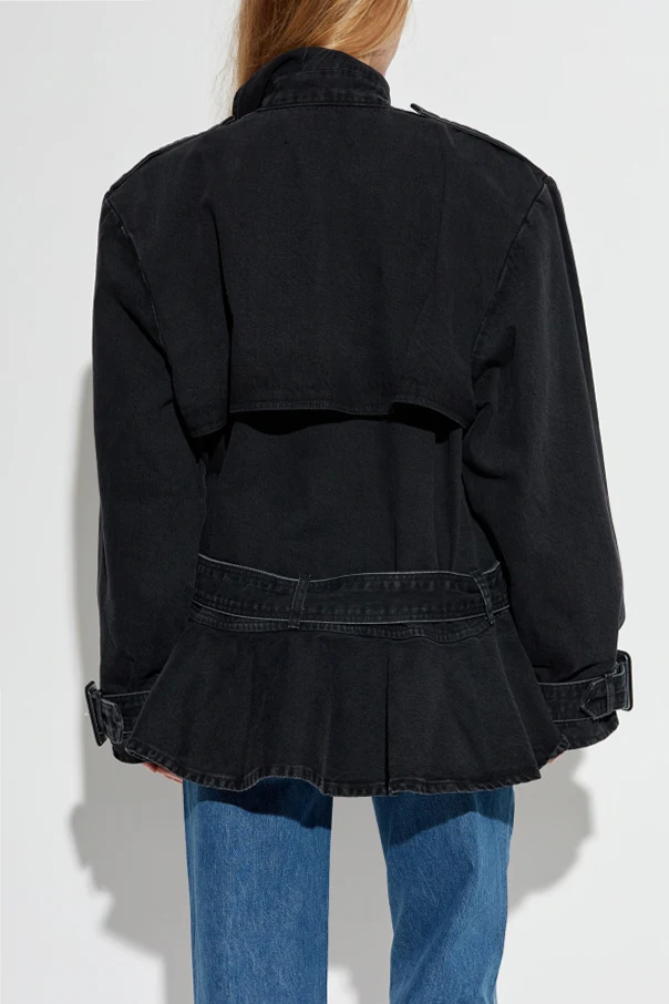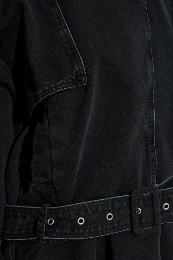 Gefertigt aus klassischem, robustem Denim mit markanter Struktur, begeistert sie durch ihre hochwertige Verarbeitung und ihren Tragekomfort. Der asymmetrische, verdeckte Knopfverschluss sowie ein breiter, eingenähter Gürtel mit Metallschnalle und dekorativen Ösen ermöglichen eine individuelle Passform und betonen die Silhouette. Der gleiche Verschluss wurde an den Manschetten verwendet und unterstreicht den durchdachten Gesamteindruck.