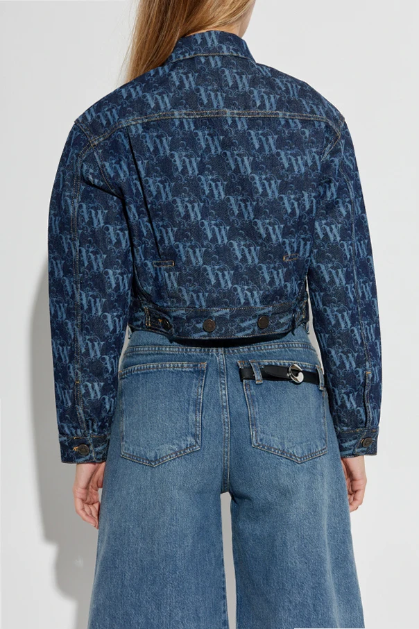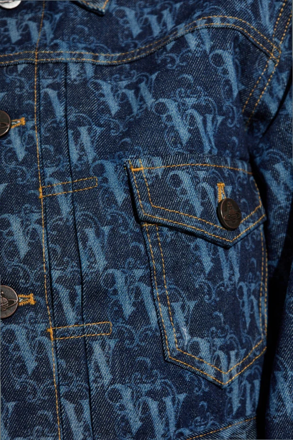 Jeansjacke mit Monogramm von Vivienne Westwood verkörpert anspruchsvolle Handwerkskunst und den Geist des Nonkonformismus. Die kurze, klassische Crop-Jacke mit langen Ärmeln, die mit Manschetten abschließen, sowie dem zeitlosen Kragen, sorgt für eine perfekt ausbalancierte Silhouette.