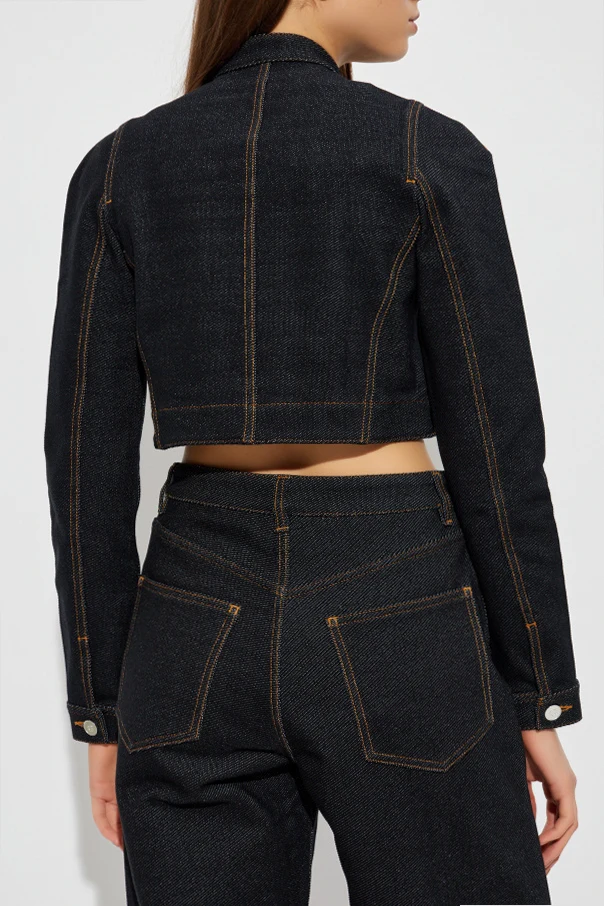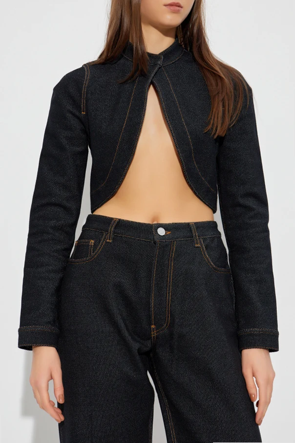 Jeansjacke mit Stehkragen von Alaïa begeistert durch die edle Ausstrahlung des dunkelblauen Denims und eine außergewöhnlich elegante Silhouette. Der kurze, figurbetonte Schnitt betont die Vorzüge der Figur deutlich, während die dezent offene Front in Form eines umgekehrten V dem Gesamtbild Leichtigkeit und Modernität verleiht. Sorgfältig verarbeitet und mit langen, geraden Ärmeln mit Manschettenabschluss präsentiert sie sich besonders raffiniert.