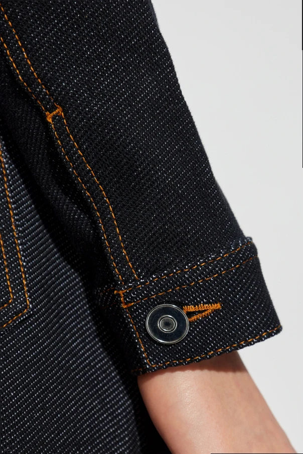 Der einzigartige Charakter wird durch kontrastierende, orangefarbene Nähte zusätzlich hervorgehoben, die den modischen Anspruch dieses Modells gekonnt unterstreichen. Hochwertiger, dunkelblauer Denim – eine Komposition aus Baumwolle, Polyamid und Elasthan – garantiert Langlebigkeit, ein weiches Tragegefühl und eine dezente Betonung der Körperlinie. Die unvergleichliche Präzision im Detail, charakteristisch für das Modehaus Alaïa, macht jedes Element dieser Jacke zu einem Ausdruck von handwerklichem Können und zeitloser Eleganz.