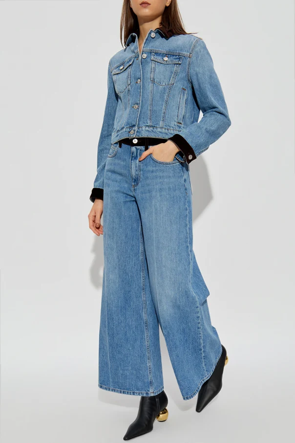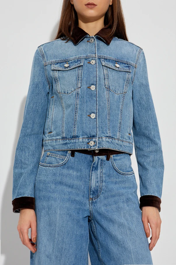 Jeansjacke mit Samtbesätzen von Marni ist eine außergewöhnliche Hommage an die Klassiker in einer modernen Interpretation. Gehalten in einem edlen Blauton, besticht sie durch ihre zeitlose Silhouette – kurz, dezent tailliert und subtil die Figur betonend.