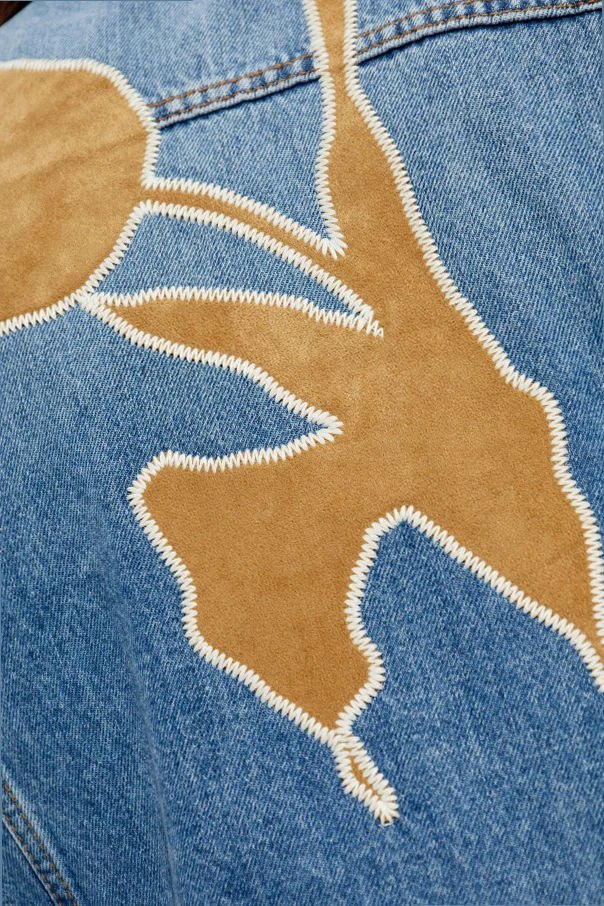 Präzise ausgewählter, hochwertiger Denim begeistert mit kontrastierenden Ziernähten, während der braune Samtkragen und die Samtmanschetten die Eleganz dezent abrunden. Auf der Rückseite zieht ein Designer-Applikation aus camelfarbenem Wildleder in Form einer abstrakten Pflanze die Blicke auf sich, akzentuiert durch einen fein gearbeiteten weißen Zickzackstich.