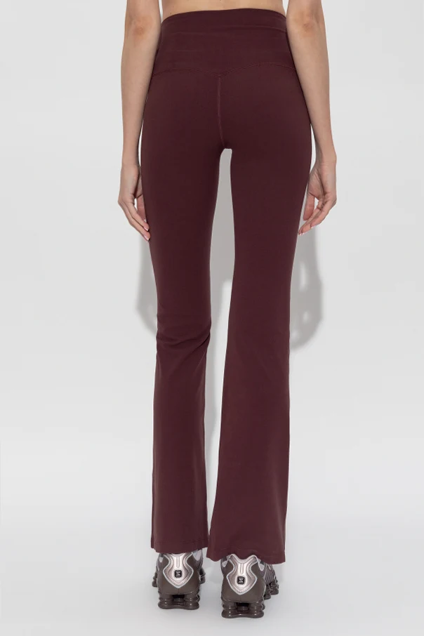 Trainingsleggings in einem tiefen Bordeaux-Ton sind die Quintessenz raffinierter Schlichtheit und modernen Designs. Das Modell zeichnet sich durch einen hohen Bund aus, der die Silhouette effektvoll betont und außergewöhnlichen Komfort bei jeder Trainingsintensität garantiert. Der charakteristische, leicht ausgestellte Flare-Schnitt der Beine kreiert eine schlankmachende Beinlinie und entspricht den neuesten Trends der aktiven Mode.