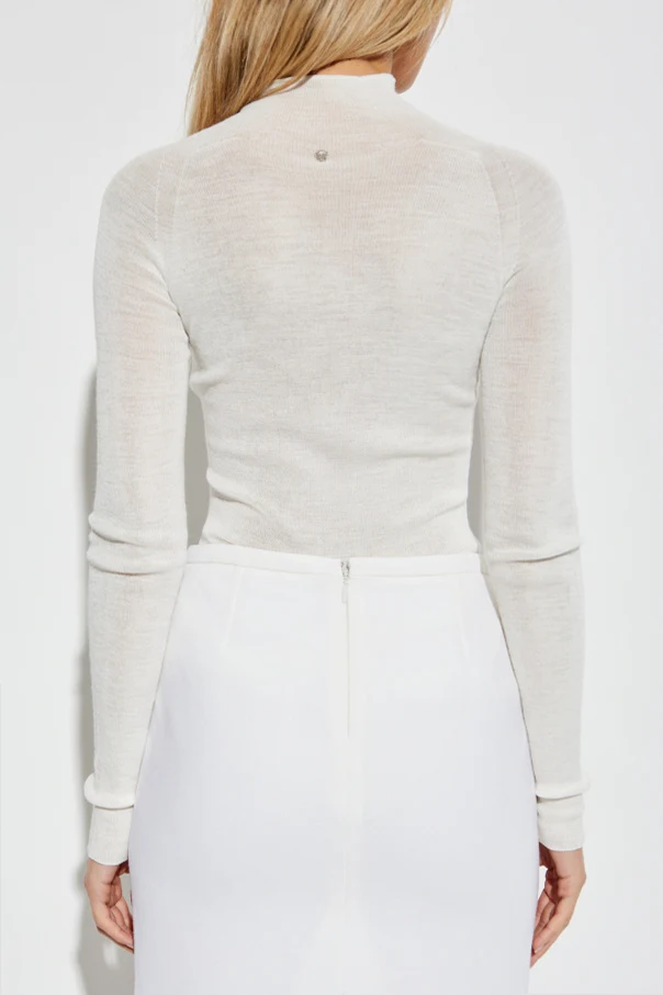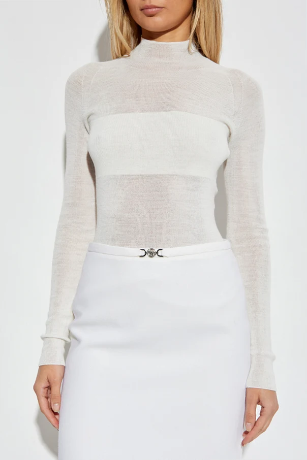 Turtleneck mit figurbetontem Schnitt von Versace ist die Essenz raffinierten Minimalismus, bei dem die weiße Farbe dominiert und zeitlose Eleganz unterstreicht. Der Slim-Fit-Schnitt mit langen Ärmeln und hohem Kragen akzentuiert die Silhouette dezent und verleiht jedem Outfit einen Hauch von Klasse.