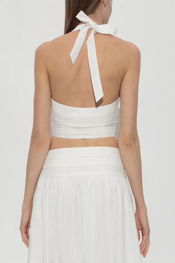 Breite Träger , die am Nacken zu einem dekorativen Knoten gebunden werden, überzeugen durch ihre Detailverliebtheit, während der offene Rücken mit subtiler Sinnlichkeit die Blicke auf sich zieht. Die präzise ausgearbeitete Büstenlinie wird durch ein elegantes Band über der Brust betont, was einen harmonischen Gesamteindruck schafft. Glatter, leicht strukturierter Baumwollstoff sorgt für eine perfekte Passform und garantiert Komfort bei exklusiver Ausstrahlung.