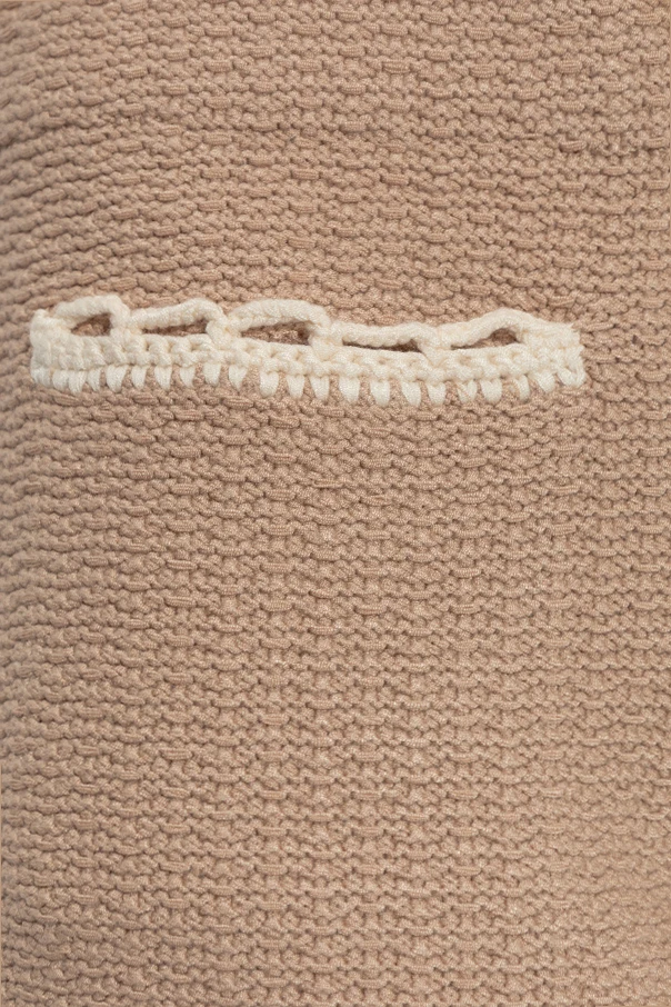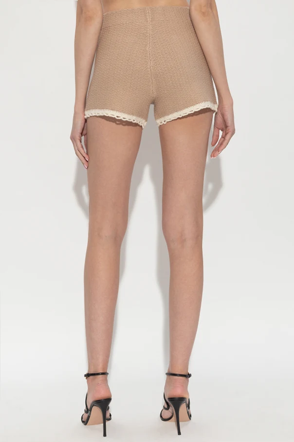 Die beige Farbe bildet die elegante Basis des gesamten Designs, während die raffinierten, cremefarbenen Abschlüsse an den unteren Kanten sowie an den angedeuteten Taschen den Shorts eine außergewöhnliche Note verleihen. Sorgfältig gefertigte Details, das filigrane Strickmuster und das Fehlen sichtbarer Logos sorgen für einen einzigartigen und zeitlosen Ausdruck.