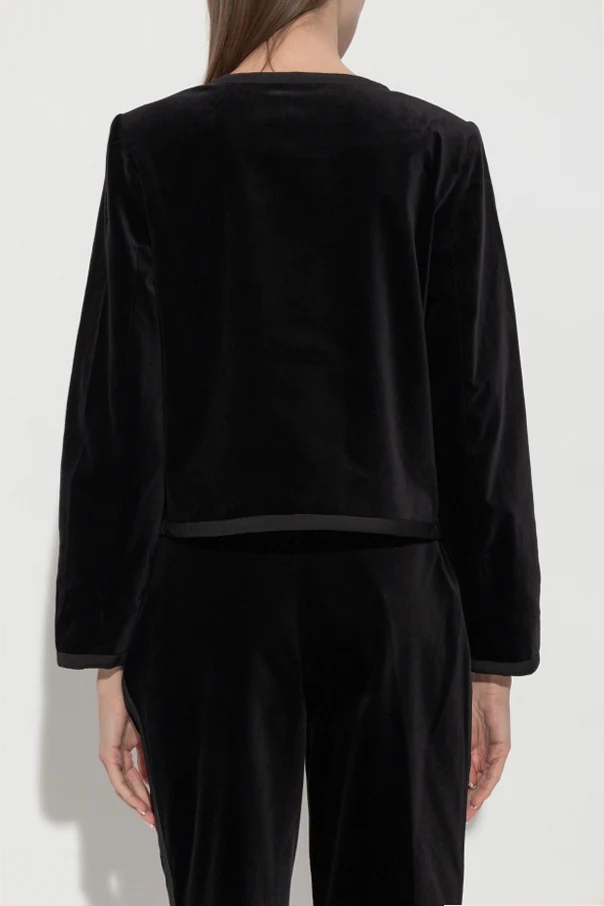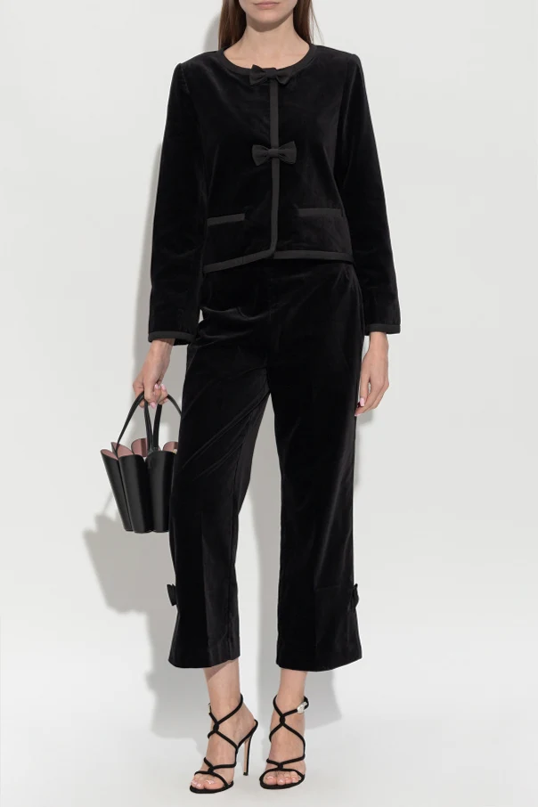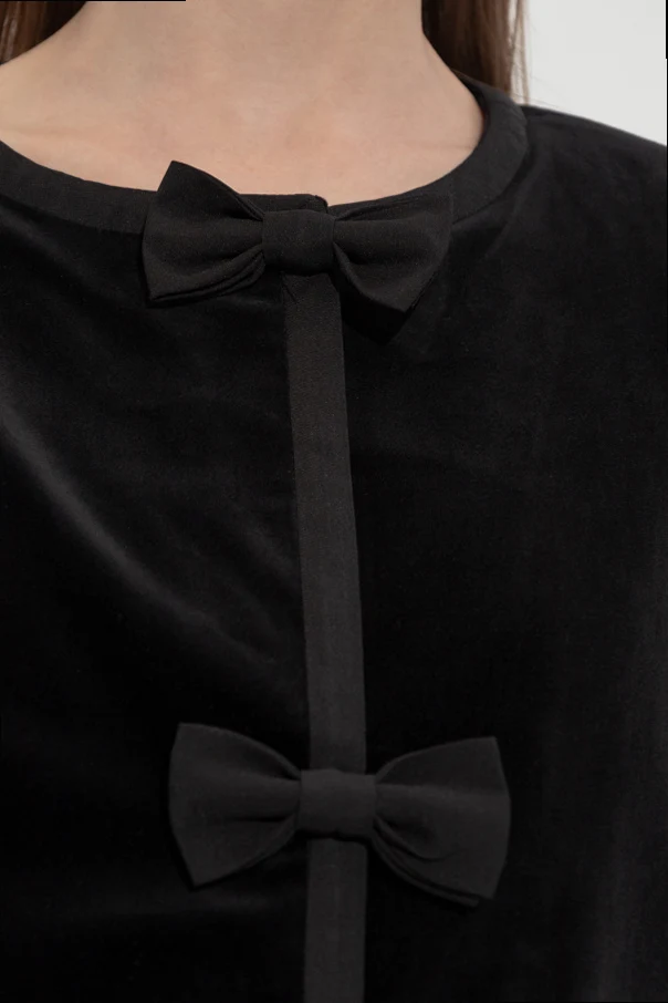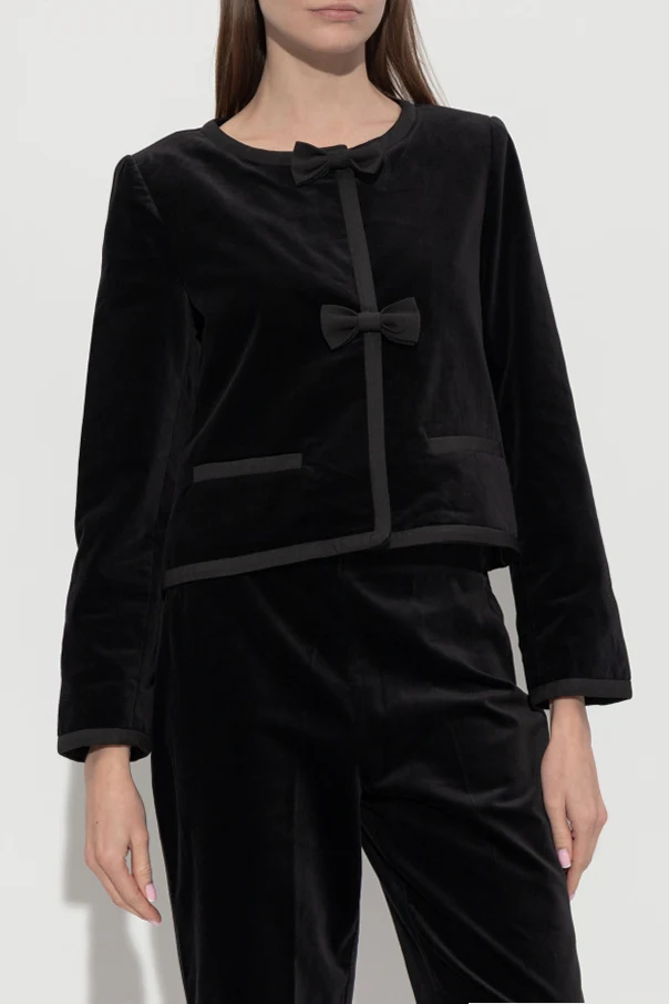 Die Oberfläche aus weichem, edlem Samt reflektiert sanft das Licht und wird durch markante Paspelierungen aus farblich abgestimmtem, schwarzem Stoff zusätzlich betont. Zwei kunstvoll gearbeitete Schleifen – eine am Halsausschnitt, die andere mittig auf der Vorderseite – setzen einen besonders femininen Akzent, der alle Blicke auf sich zieht und den individuellen Stil unterstreicht.
