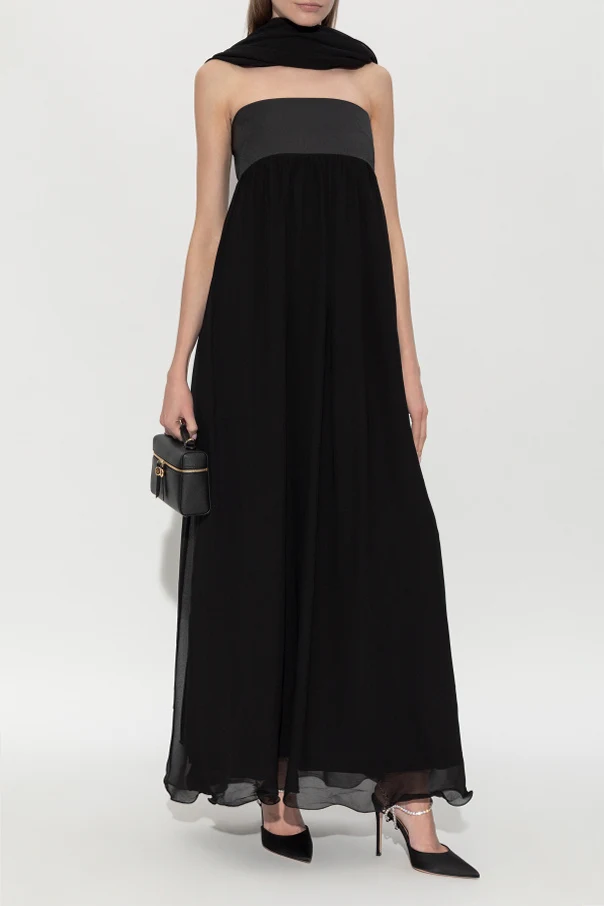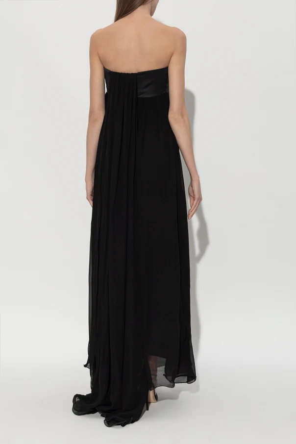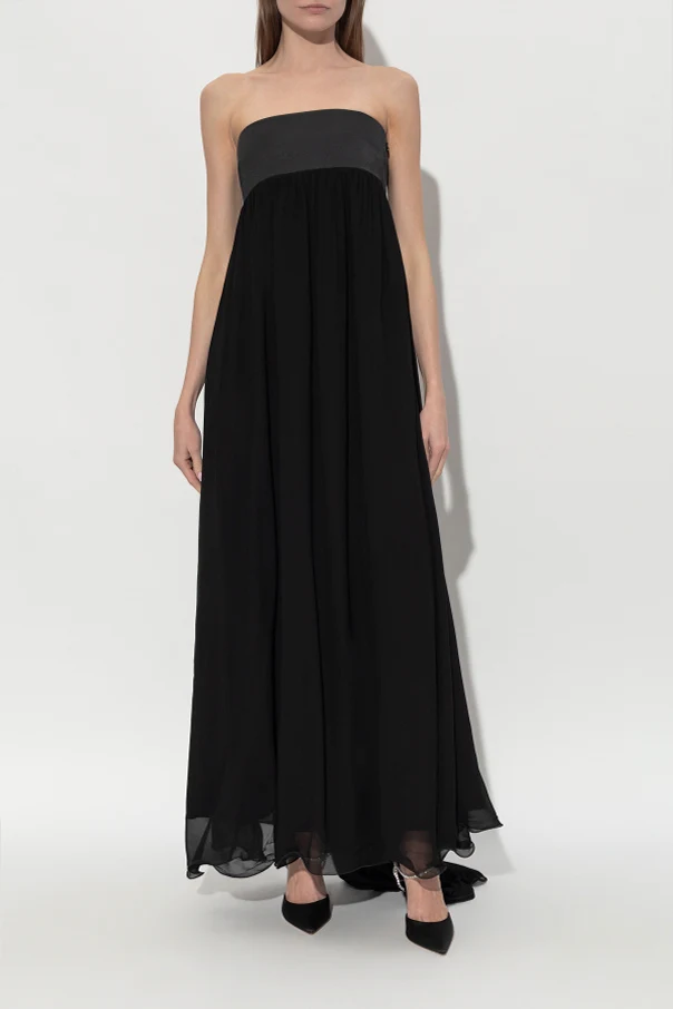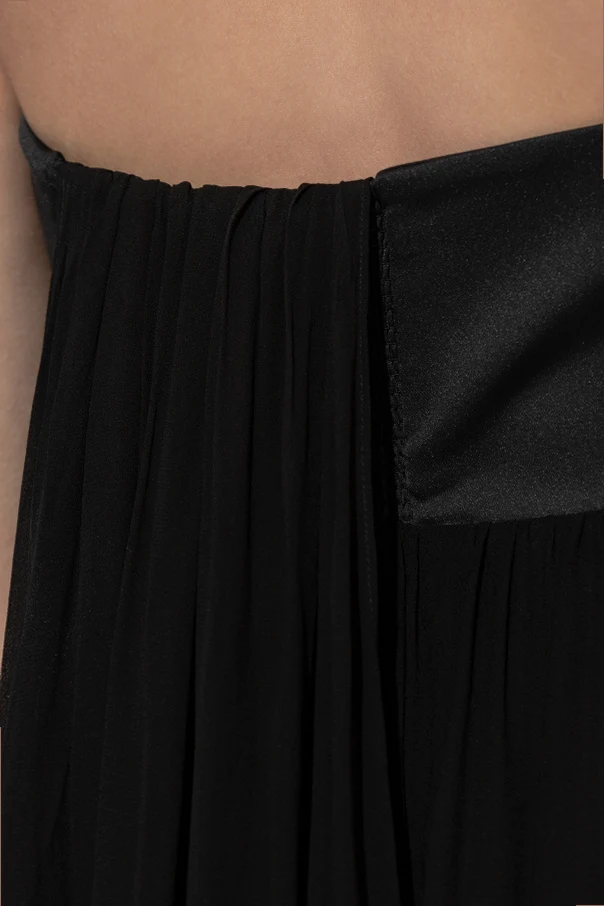 Das Oberteil des Kleides besteht aus glänzender, satinierter Viskose, während der Rock aus einem ätherischen, halbtransparenten Stoff mit kunstvoller Verarbeitung und sinnlichen Raffungen gefertigt ist. Das Fehlen sichtbarer Logos verleiht dem Modell eine zurückhaltende, minimalistische Luxus-Ausstrahlung. Der unregelmäßige Saum harmoniert wunderschön mit der Bewegung und zieht durch seine subtile Einzigartigkeit alle Blicke auf sich.