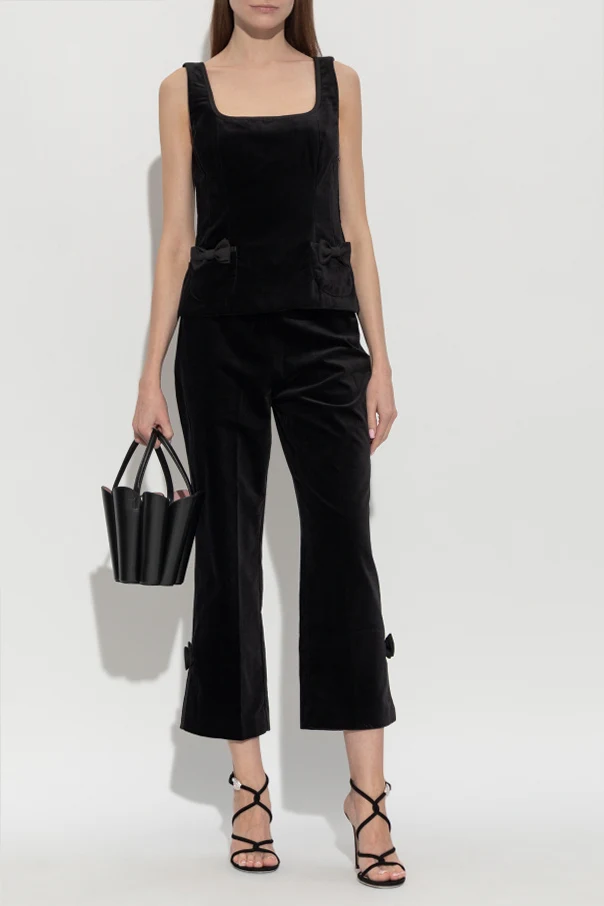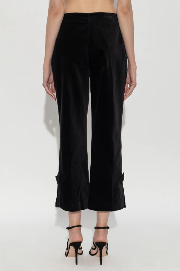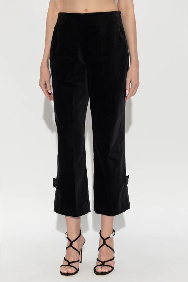 Das Fehlen sichtbarer Nähte auf der Vorderseite und das minimalistische Design der Details unterstreichen den Fokus auf meisterhafte Verarbeitung. Besonders ins Auge fallen die dezenten, dekorativen Schleifen an den Waden, die aus demselben Stoff gefertigt sind und den einzigartigen Charakter der Hose hervorheben. Die perfekt gearbeiteten Säume und der klassisch glatte Bund zeugen von höchster Sorgfalt bei jedem Detail.