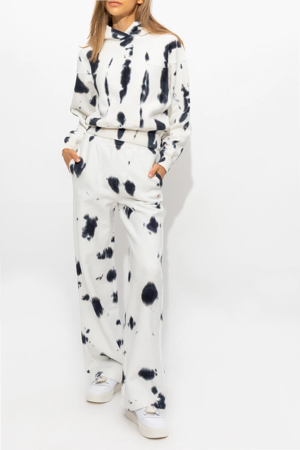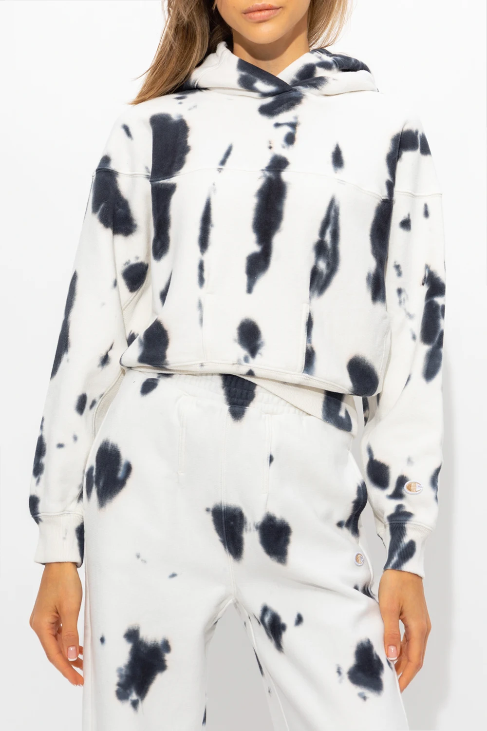 White and navy hoodie from Champion. Crafted from cotton, this design features a tie-dye effect, sleeve patch with a logo, decorative stitching at the hem and ribbed trims at the hem and cuffs.