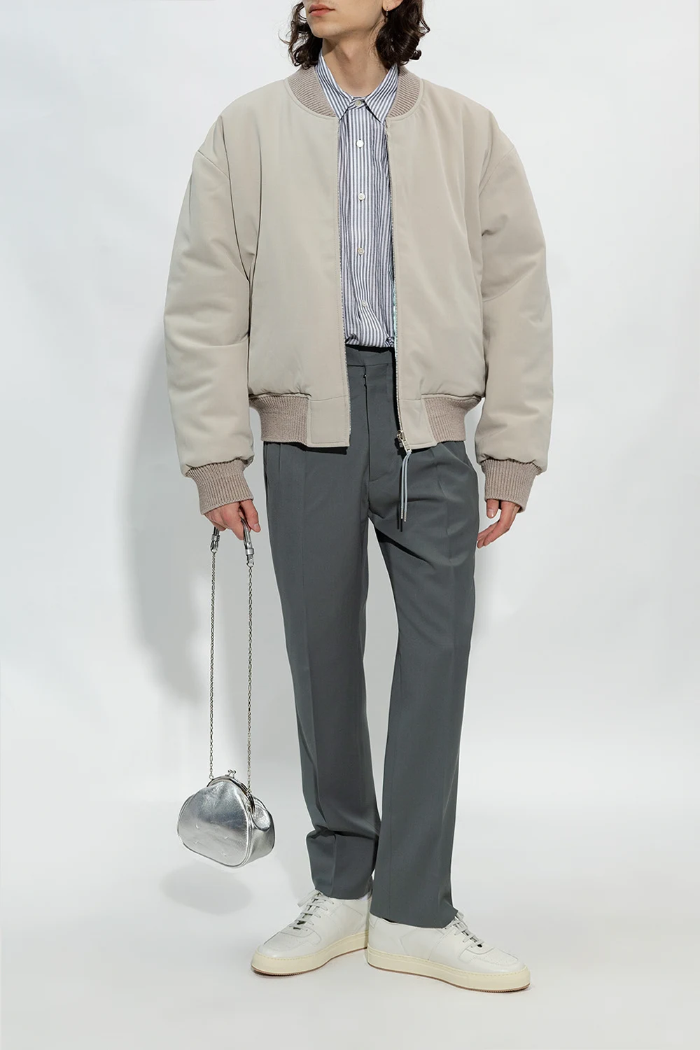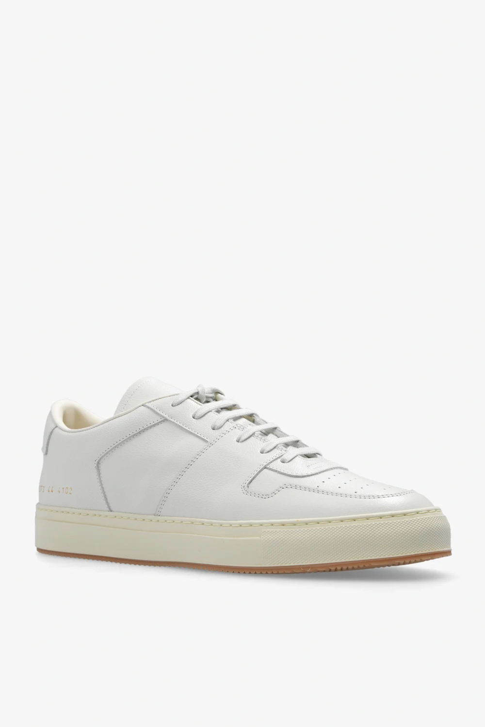 White ‘Decades’ sneakers from Common Projects. Made of leather, this lace-up model sits on a beige and cream rubber sole and showcases a perforated toe and a signature gold-tone serial number stamped on the side.