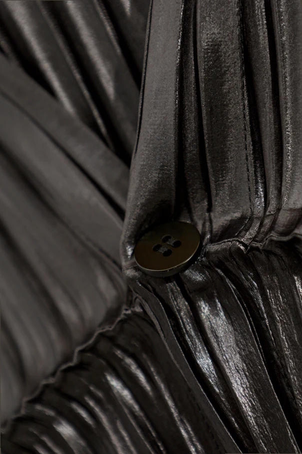 Das Modell besteht aus einem edlen Strickmaterial mit metallischem Glanz , inspiriert von Satin und modernen Technologien, meisterhaft und dicht in feine, vertikale Falten plissiert. Der Verzicht auf sichtbare Logos betont die reine, sinnliche Form, während der einzige mit Stoff bezogene Knopf in Grauton dem Ganzen kunstvolle Minimalistik verleiht.