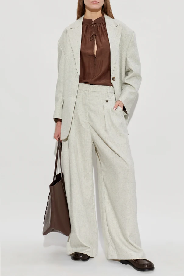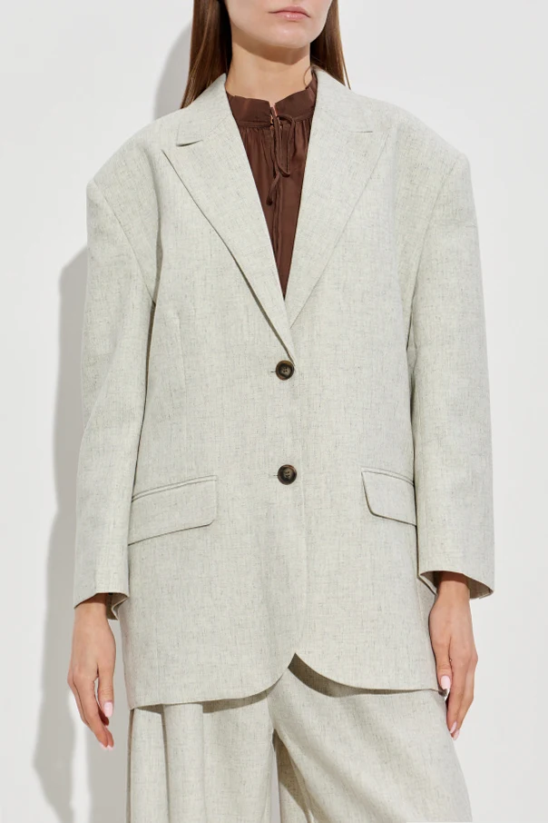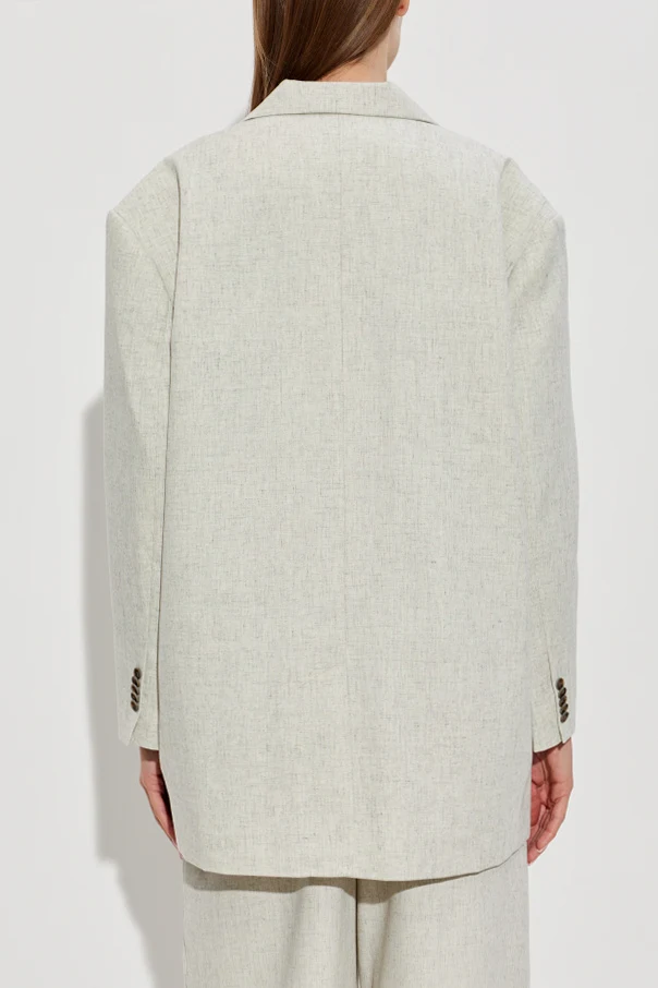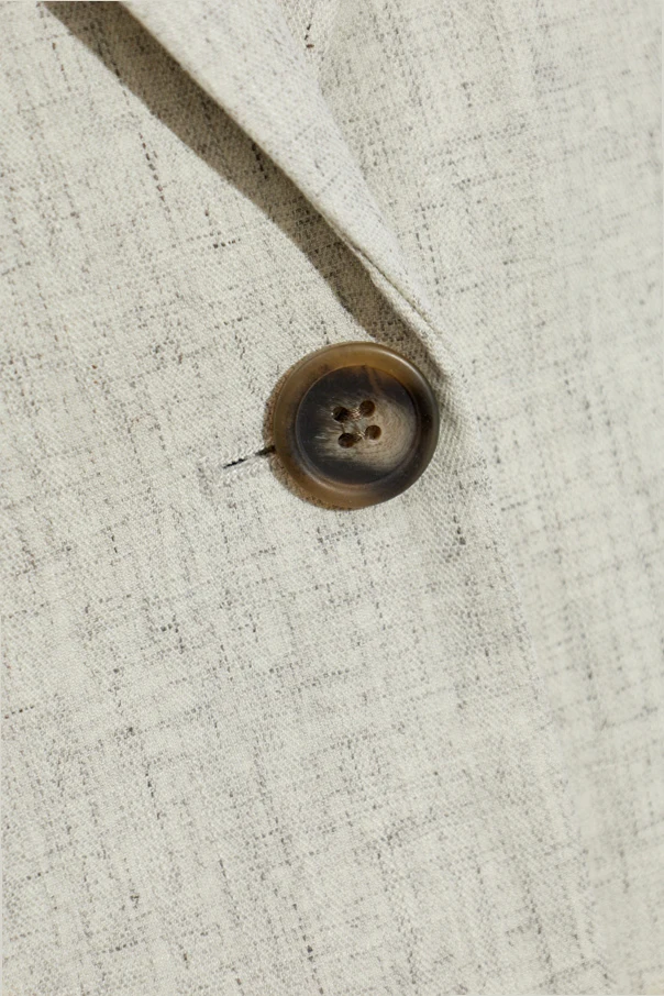 Der Rae-Blazer von Munthe verkörpert die Essenz dänischer Ästhetik, die Handwerkskunst und subtile Eleganz vereint. Im grauen Farbton gehalten, überzeugt er durch ein feines Melange-Muster und eine sichtbare, natürliche Struktur des Stoffes, der eine Kombination aus Leinen und Polyester ist. Sein gerader, verlängerter Schnitt mit leicht überschnittenen Schultern sowie die markanten, klassischen Revers schaffen eine außergewöhnlich moderne und zugleich zeitlose Silhouette.