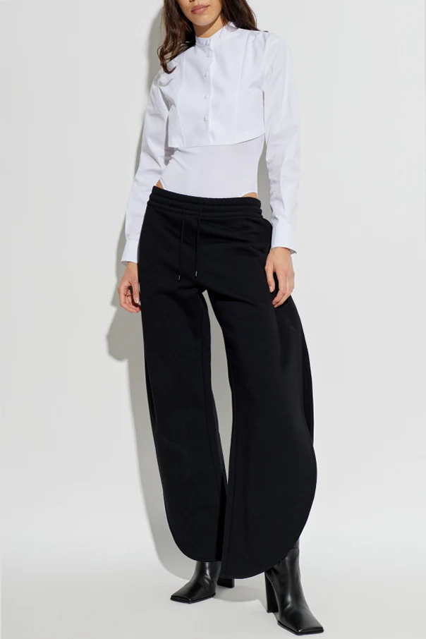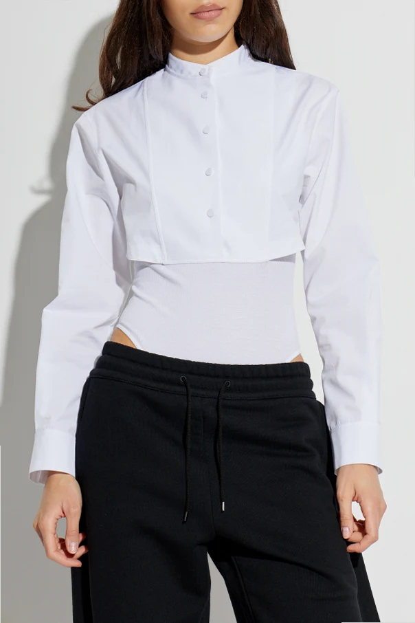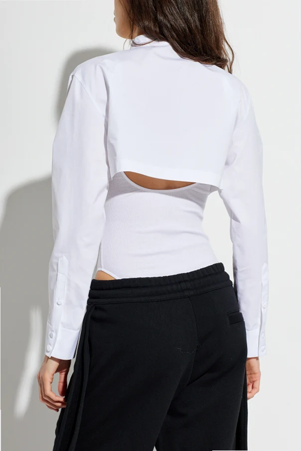 Baumwoll-Body der Marke Alaïa ist ein Beispiel für die meisterhafte Balance zwischen formeller Eleganz und moderner Lässigkeit. Der glatte, weiße Stoff von höchster Qualität unterstreicht die Zeitlosigkeit des Schnitts, während der verkürzte Schnitt des klassischen Hemdes harmonisch mit dem figurbetonten, modellierenden unteren Teil kombiniert wird, der an das klassische Body angelehnt ist.