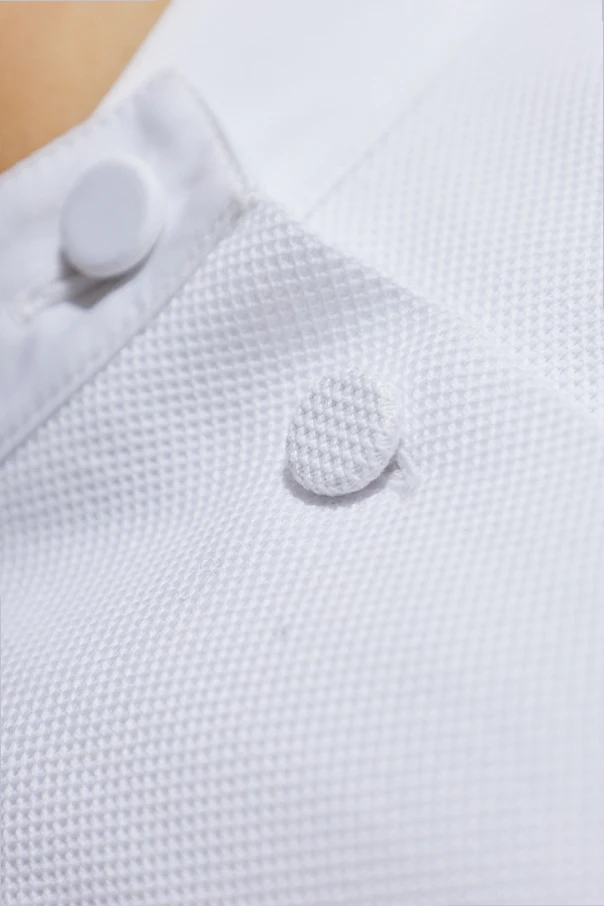 Die Vorderseite und die Ärmel, gefertigt aus edler, fester Baumwolle, garantieren eine eindrucksvolle Optik, während elastische, dezent strukturierte Seiteneinsätze sowie der untere Teil für eine makellose Passform und höchsten Tragekomfort sorgen. Der charakteristische Stehkragen und die abgesetzte Naht unter der Brust betonen die schlanke Silhouette, und die verdeckten, stoffbezogenen Knöpfe heben die Liebe zum Detail hervor.