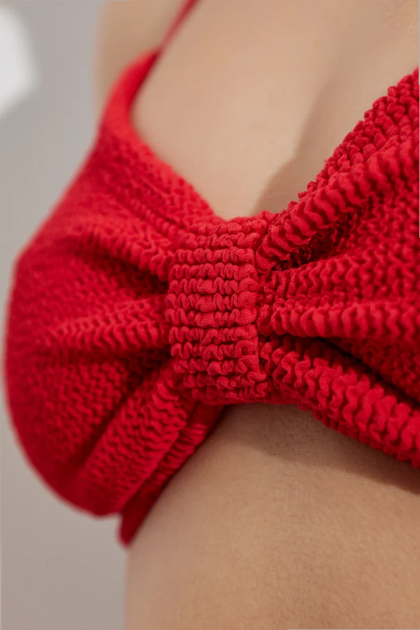 Das zweiteilige Badeanzug-Set Alicia ist die Quintessenz von raffiniertem Stil und zeitloser Eleganz. In einem roten Farbton erinnert es an Schönheit und Mut und strahlt zugleich subtile Zurückhaltung aus. Das klassische Oberteil mit schmalen Trägern, sanfter Raffung und dekorativem Knoten am Mittelsteg betont in Kombination mit taillenhohen Slips die Silhouette auf ideale Weise.