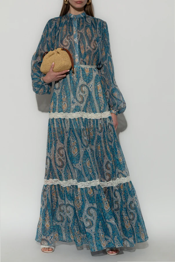 Blau als dominierende Farbe wird durch ein orientalisches Paisley-Muster ergänzt, das kunstvoll Schattierungen von Weiß, Grau und gebrochenem Orange miteinander verwebt. Kaskadenartig fallende Volants mit horizontalen Applikationen aus cremefarbener Spitze unterstreichen zusätzlich die Besonderheit des Maxi-Schnitts und formen eine harmonische, feminine Silhouette mit freiem, ausgestelltem Design.