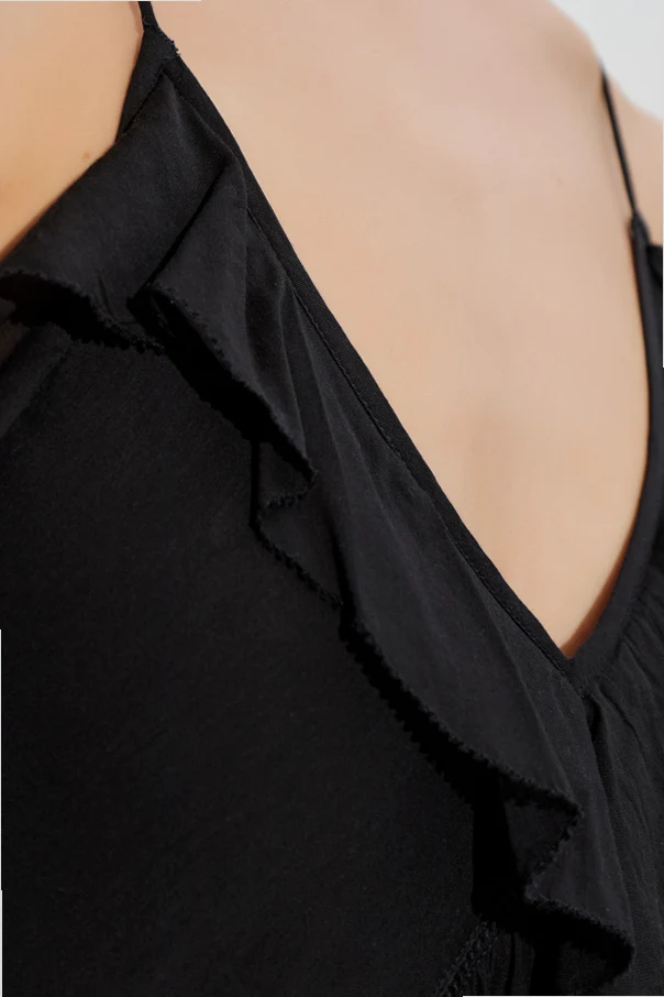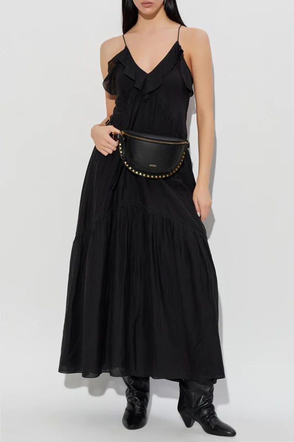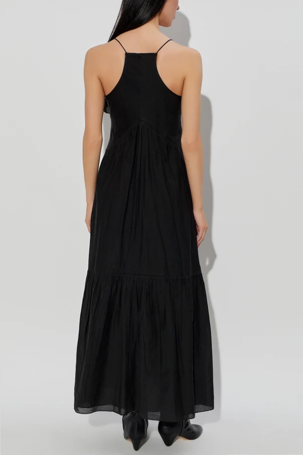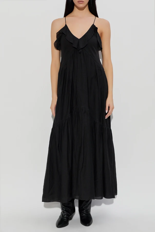Das Kleid ‘Vasma’ von Marant Étoile ist eine anspruchsvolle Kreation aus der exklusiven Kollektion, inspiriert vom subtilen Pariser Chic. Das Maxikleid im lockeren, ausgestellten Schnitt reicht elegant bis zu den Knöcheln. Feine Träger und ein V-Ausschnitt sind mit filigranen Rüschen verziert, die dem Modell einen einzigartigen Charme verleihen.