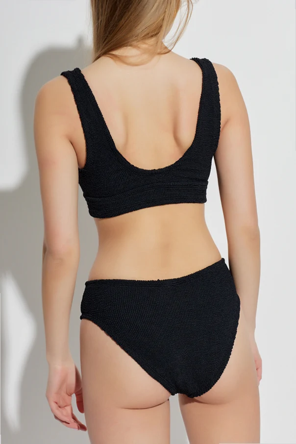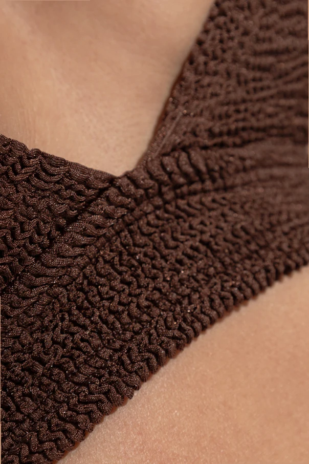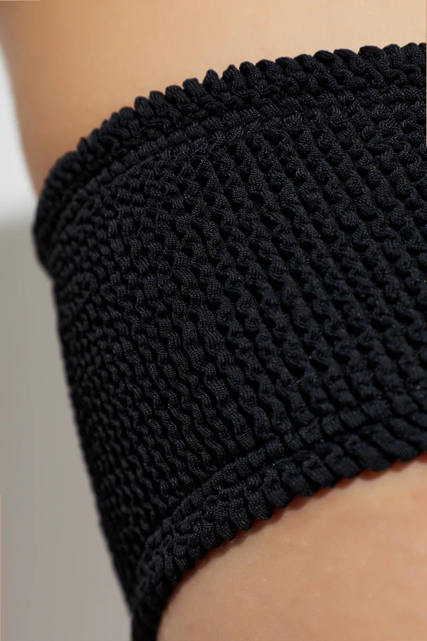 Der außergewöhnliche schwarze Stoff mit stark strukturierter, geraffter Oberfläche verleiht eine einzigartige Textur und eine beeindruckende Ausstrahlung. Der Verzicht auf Prints und Verzierungen unterstreicht die dezente, luxuriöse Aura des Badeanzugs und macht jedes Strandoutfit unverwechselbar und stilvoll. Präzise ausgewählte Materialien garantieren Komfort sowie eine ausgezeichnete Passform.