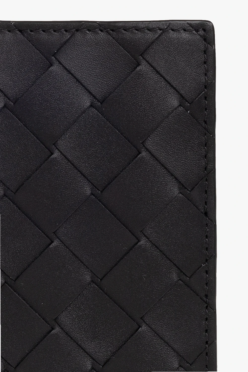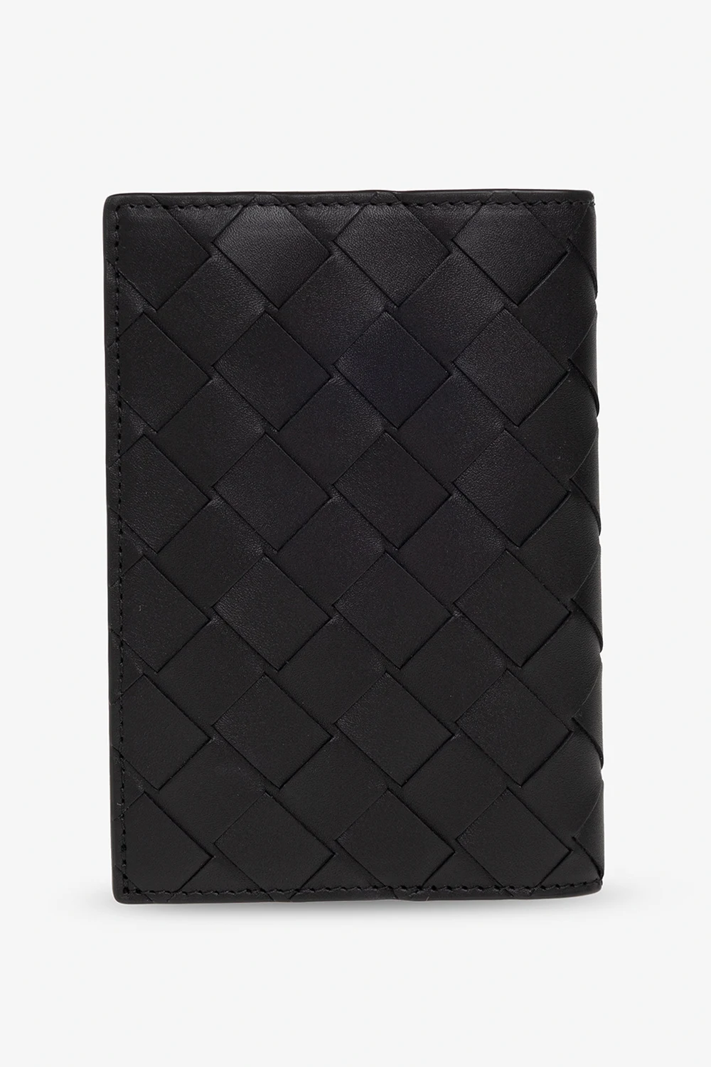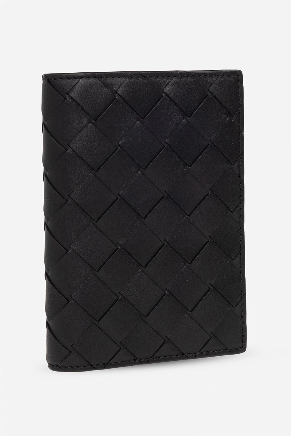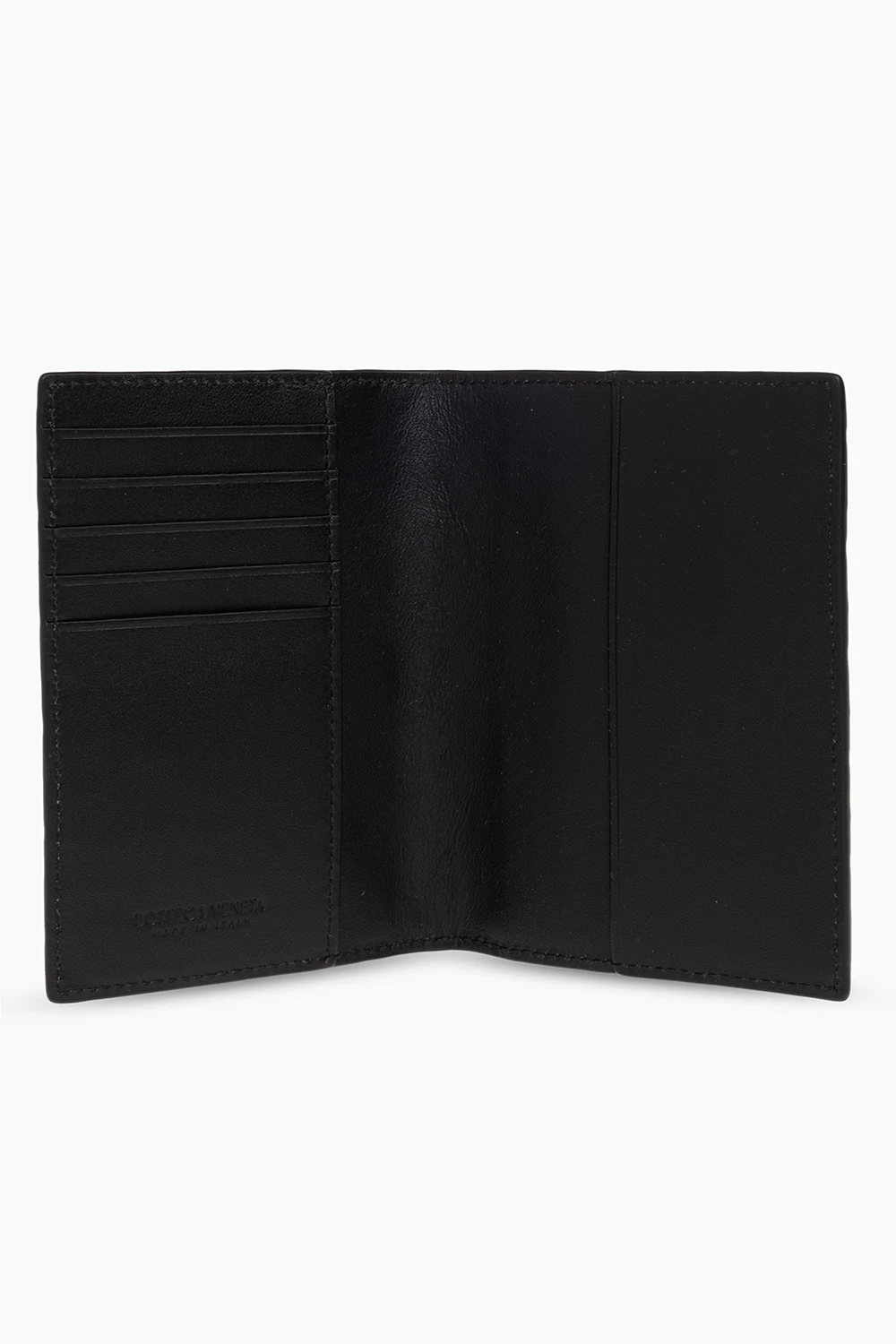 Black passport holder from Bottega Veneta. Made of calf leather with the brand’s signature Intreccio weave, this model has two slip pockets and five card slots.