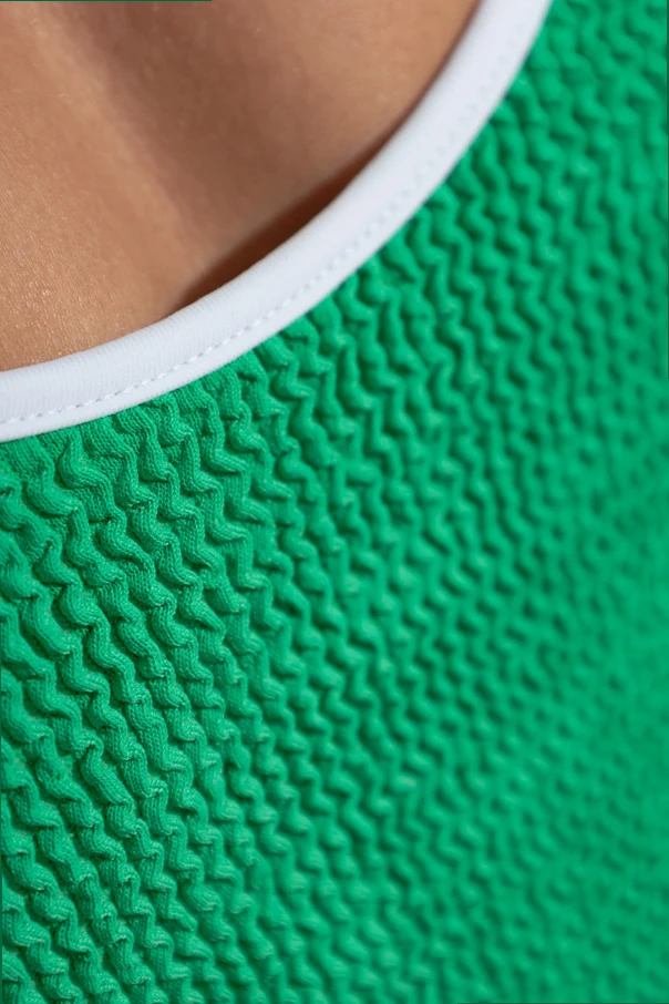 Das Material zeichnet sich durch eine markante Struktur mit dreidimensionalem, bubbligem Gewebe aus und bietet Komfort, Elastizität und eine einzigartige Haptik. Weiße Einfassungen am Ausschnitt und an den Schultern bilden einen eleganten Kontrast zum Grundton, heben die sorgfältig gearbeiteten Kanten hervor und verleihen dem Design eine moderne Leichtigkeit.