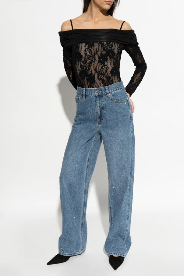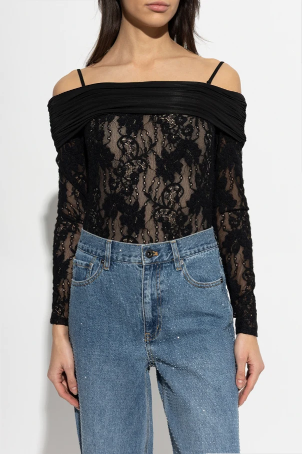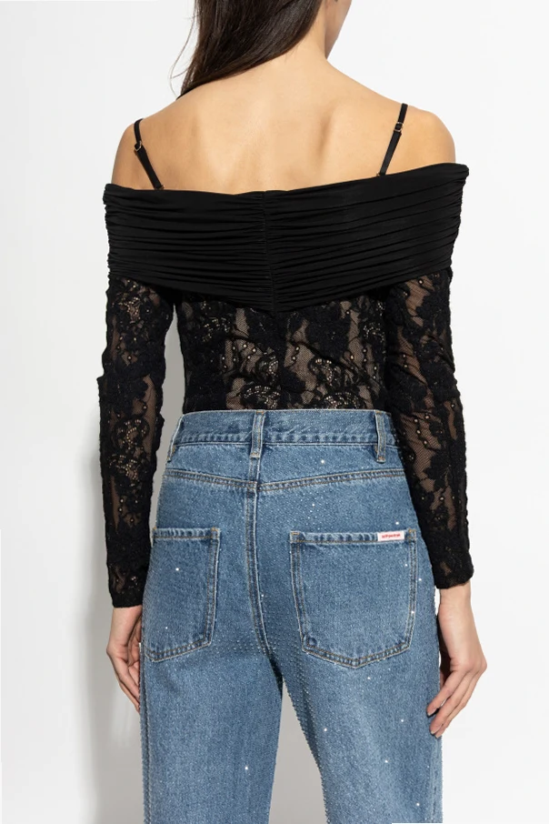 Der Schnitt passt sich der Silhouette an und sorgt für fließende Linien an den Hüften. Der breite Off-Shoulder-Ausschnitt, der mit drapiertem schwarzen Stoff veredelt ist, sowie zusätzliche schmale Träger garantieren sowohl Komfort als auch Stabilität. Das Body überzeugt durch seine durchdachte Form und das luxuriöse Material und ist damit ein Synonym für moderne, feminine Eleganz.