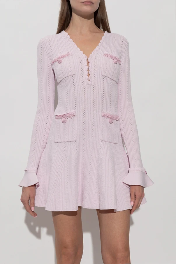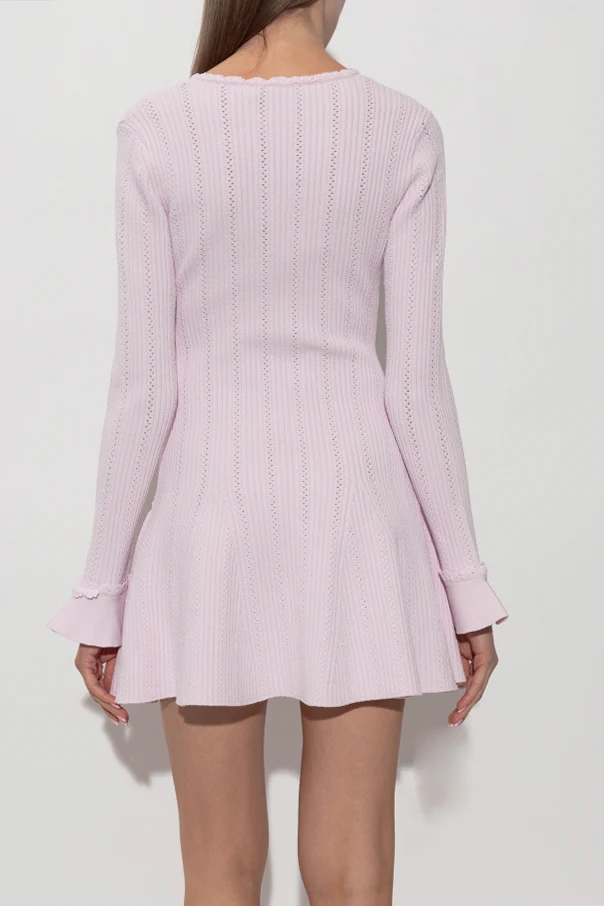 Das figurbetonte Oberteil mit betonten Schultern und der ausgestellte, kurze Rock kreieren eine harmonische Silhouette. Das Strickmaterial mit vertikalem Ajourmuster, der tiefe V-Ausschnitt mit gewelltem Abschluss und die langen Ärmel, die mit einer zarten Welle enden, unterstreichen den raffinierten Stil dieses Kleides.