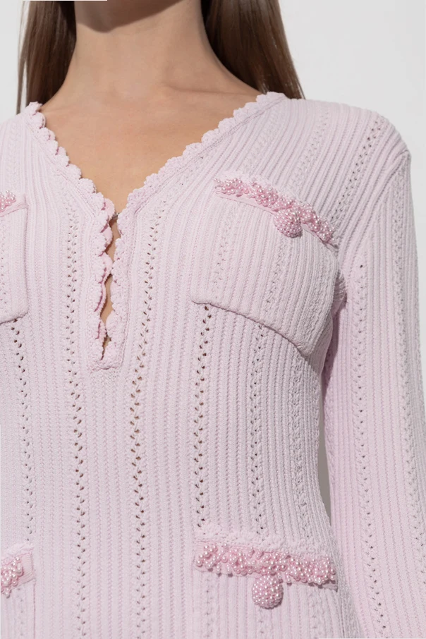 Kleid mit dekorativen Perlen der Marke Self-Portrait vereint unvergleichliche Eleganz und raffinierte Schneidekunst. Die dominante, rosa Farbe verleiht dem Styling Leichtigkeit und Subtilität und unterstreicht den einzigartigen Charakter des Modells.