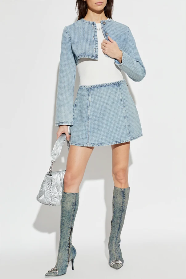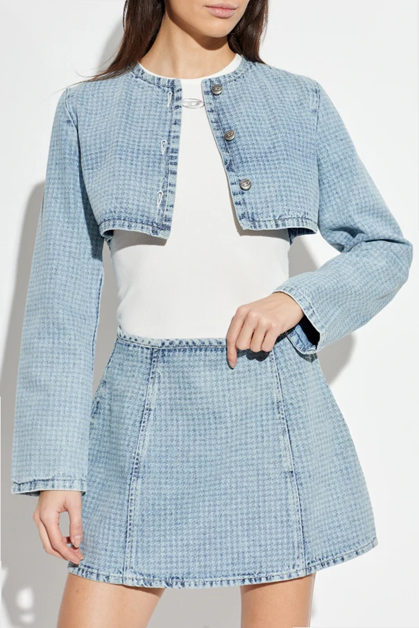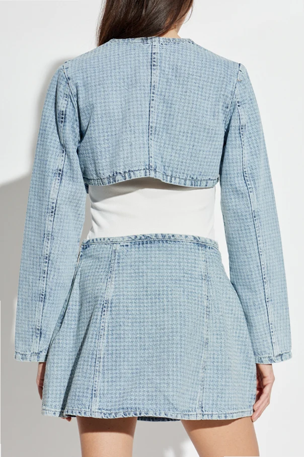 Jeansjacke ‘DE-TERRI-S’ ist ein Ausdruck modernen Designs und einer Ästhetik, die sich in einer minimalistischen Form präsentiert. Der kurze Cropped-Schnitt, die langen, geraden Ärmel und der runde, kragenlose Ausschnitt verleihen ihr einen dezent zeitgemäßen Charakter. Ihr hellblauer Denim mit meliertem, gewaschenem Finish besticht durch ein raffiniertes, geometrisches Muster, das die Individualität der Trägerin unterstreicht.