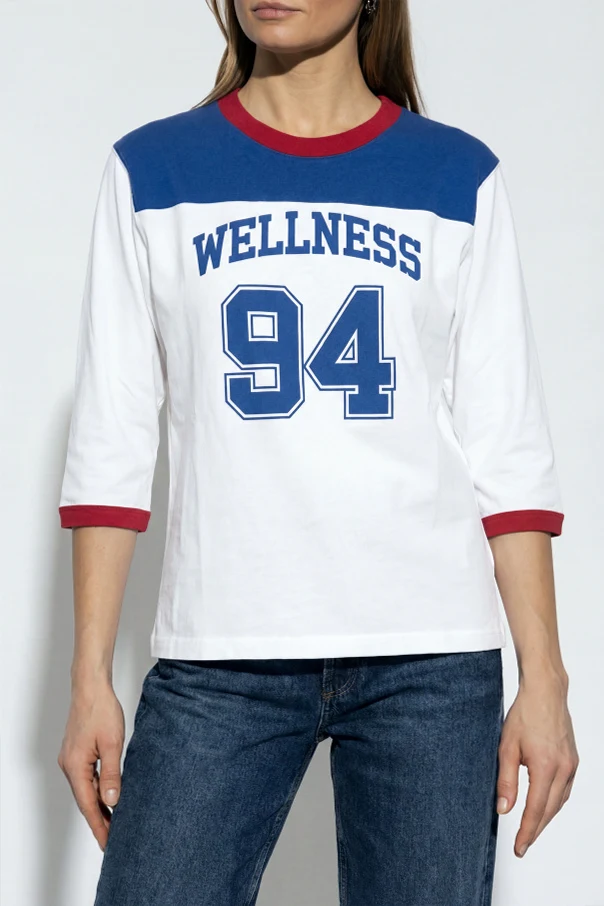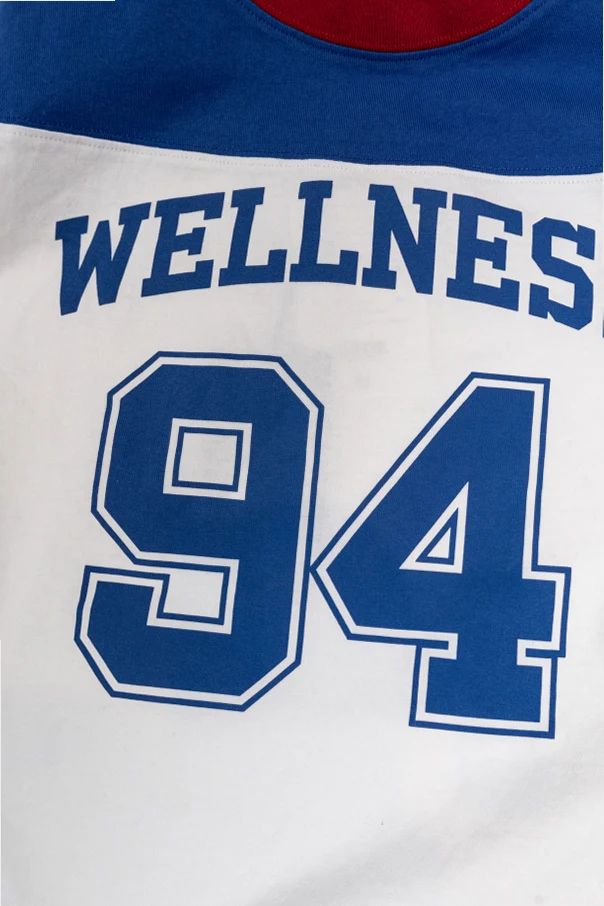 Die Vorderseite ziert ein großer, auffälliger Print – der blaue Schriftzug „WELLNESS“ sowie die Zahl „94“ – harmonisch eingebettet in das universitäre Vintage-Flair. Für höchsten Tragekomfort sorgt ein weiches, edles Jersey aus hochwertiger Baumwolle.