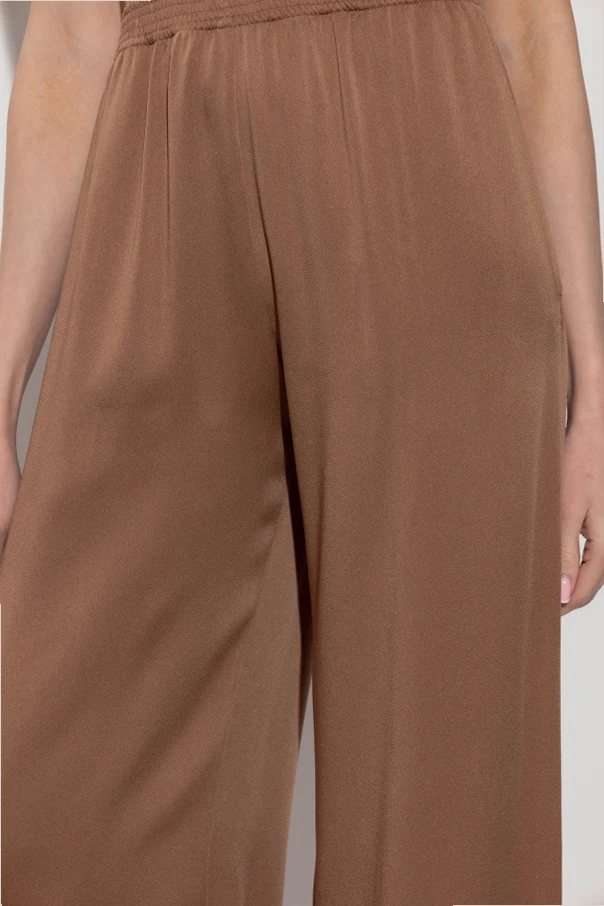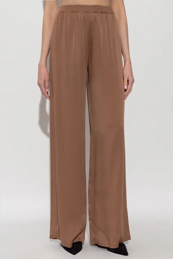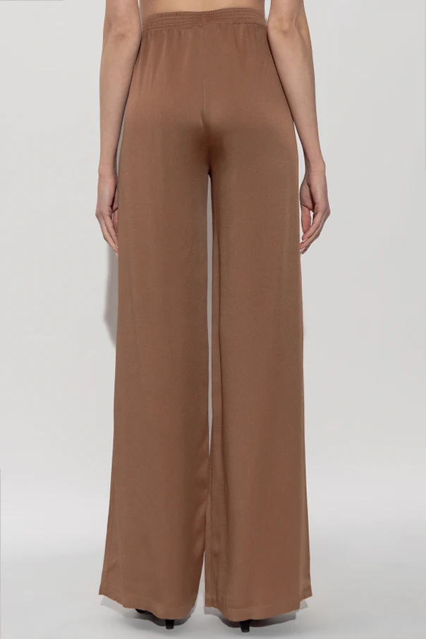 Die charakteristischen, sehr weiten Palazzobeine in Kombination mit einem bequemen, elastischen Bund mit breitem Gummizug garantieren Bewegungsfreiheit und eine exzellente Passform. Die Hose ist einfarbig, braun , ohne sichtbare Ziernähte, Taschen oder Verzierungen gestaltet – was ihr einen zeitlosen, minimalistischen Charakter verleiht.
