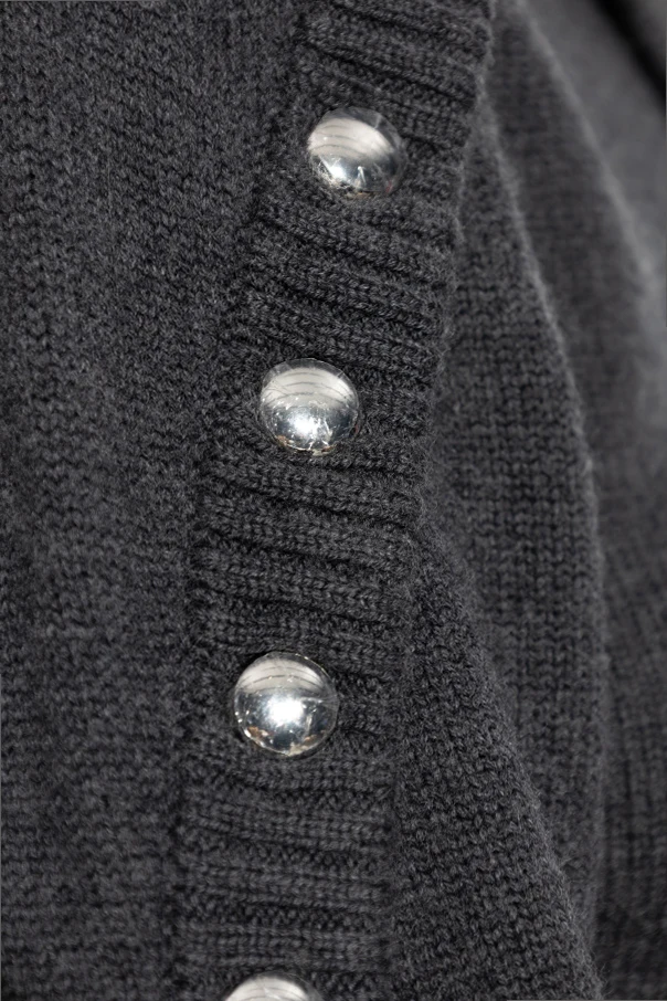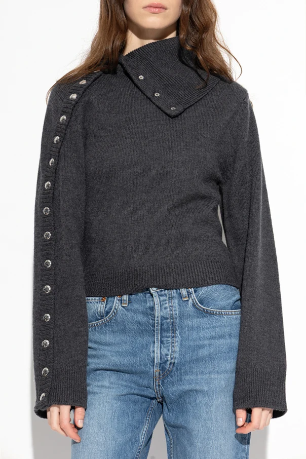 Der außergewöhnliche, asymmetrische Kragen zusammen mit glänzenden, metallischen Knöpfen, die von der Schulter bis zum Ärmel verlaufen, verleihen dem Gesamtbild einen einzigartigen, industriellen Charakter. Sorgfältig gearbeitete Ärmel und der Saum des Pullovers heben die handwerkliche Qualität sowie die Liebe zum Detail hervor.
