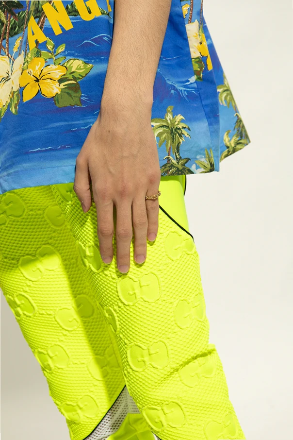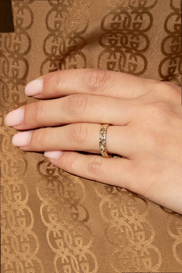 Gold-tone ring from Gucci. Made of 18k yellow gold, this item showcases arabesque engraving and a cut-out Interlocking G logo.