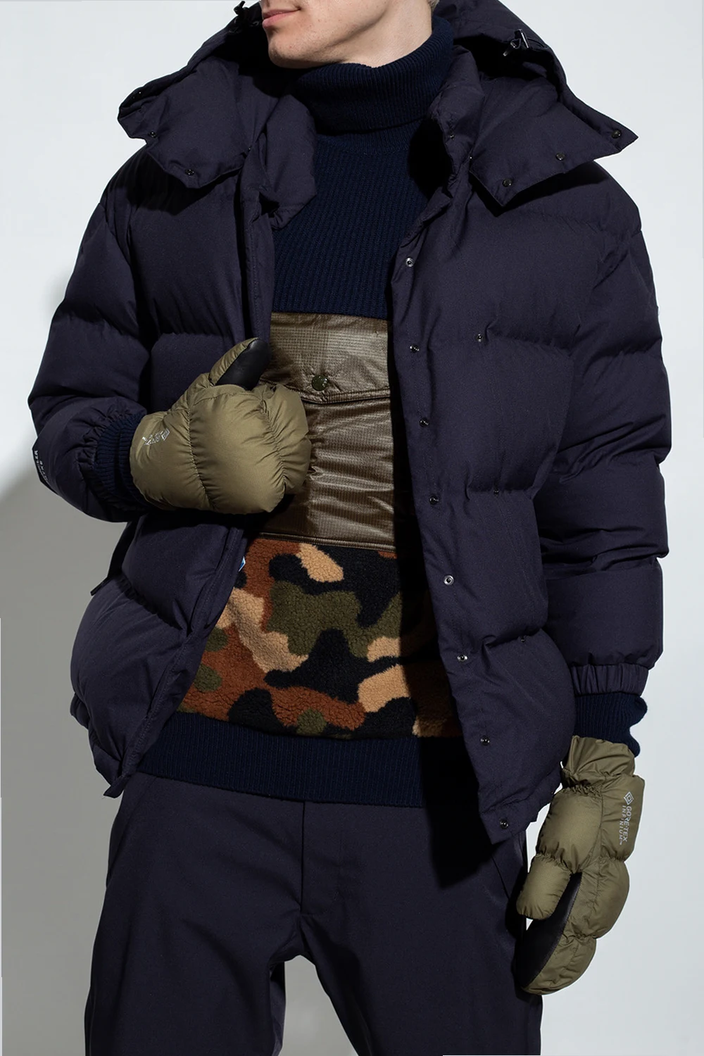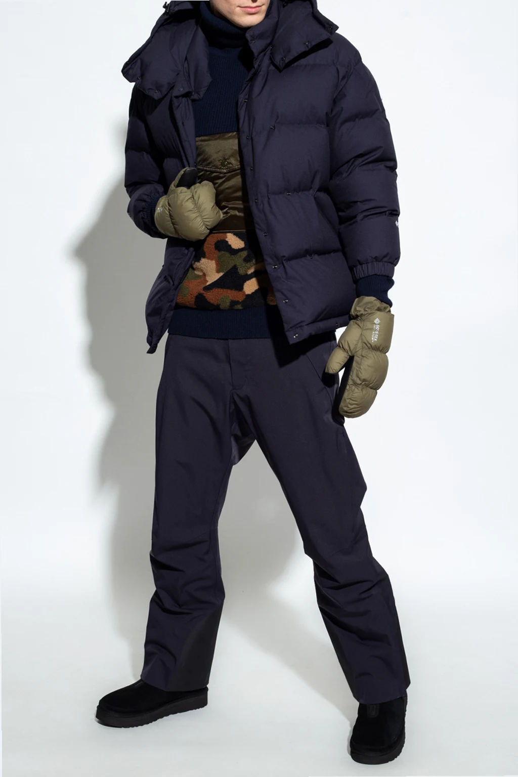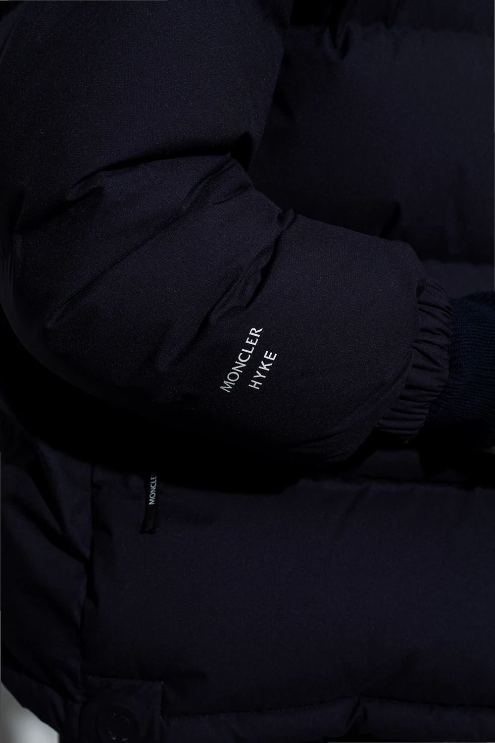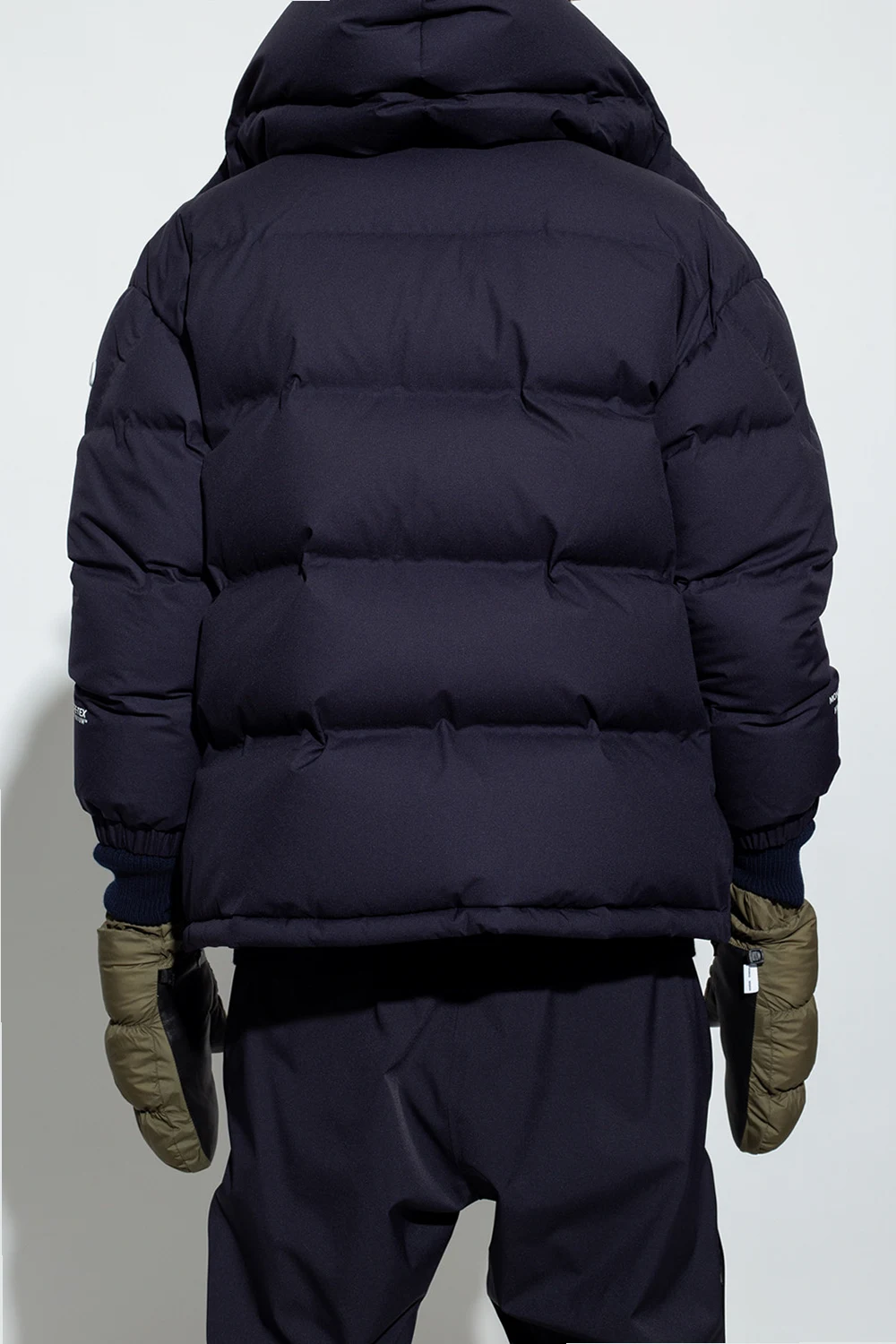Navy blue ‘Altelsis’ down jacket from Moncler Genius, the ‘Hyke no. 4’. collection. Made of breathable, windproof and waterproof GORE-TEX Infinium™ material, this style showcases a logo application, a graphic logo print, snap fastenings, two zipped pockets, long sleeves with elasticated cuffs and a drawcord-adjustable hood and hem.