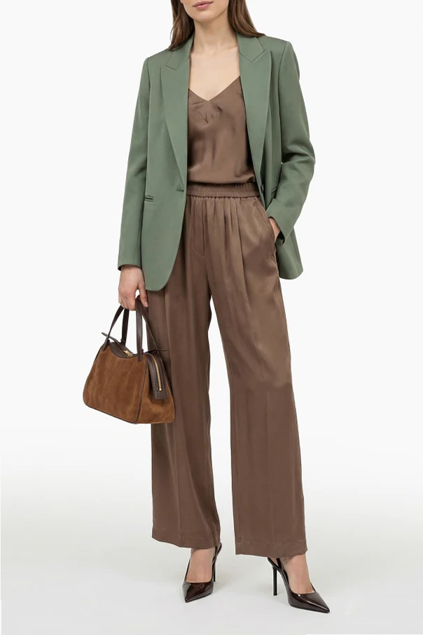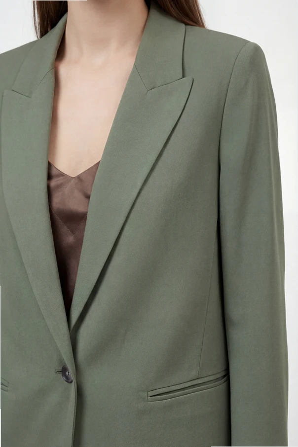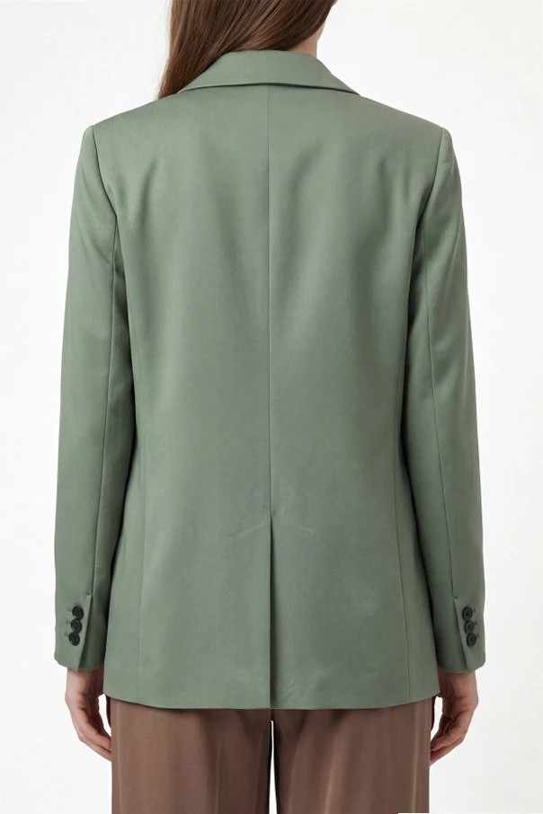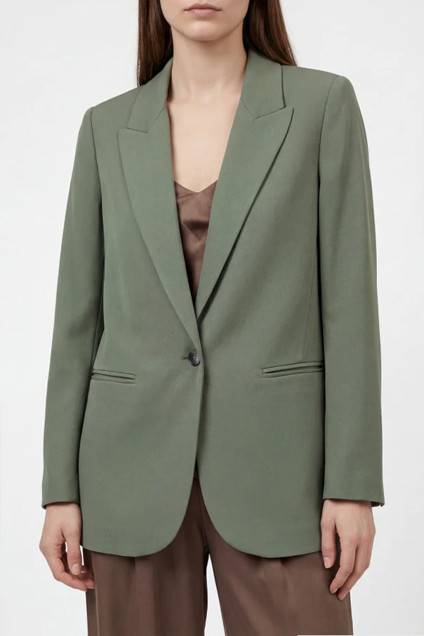 Satinierte Blazer mit einfachem Schlitz ist die perfekte Wahl für Frauen, die einzigartige Eleganz und makellose Verarbeitung schätzen. In einem dezenten, aber ausdrucksstarken Grünton begeistert der Blazer mit seinem klassischen Schnitt, der durch einen Hauch von Oversize und breite, spitz zulaufende Revers betont wird.