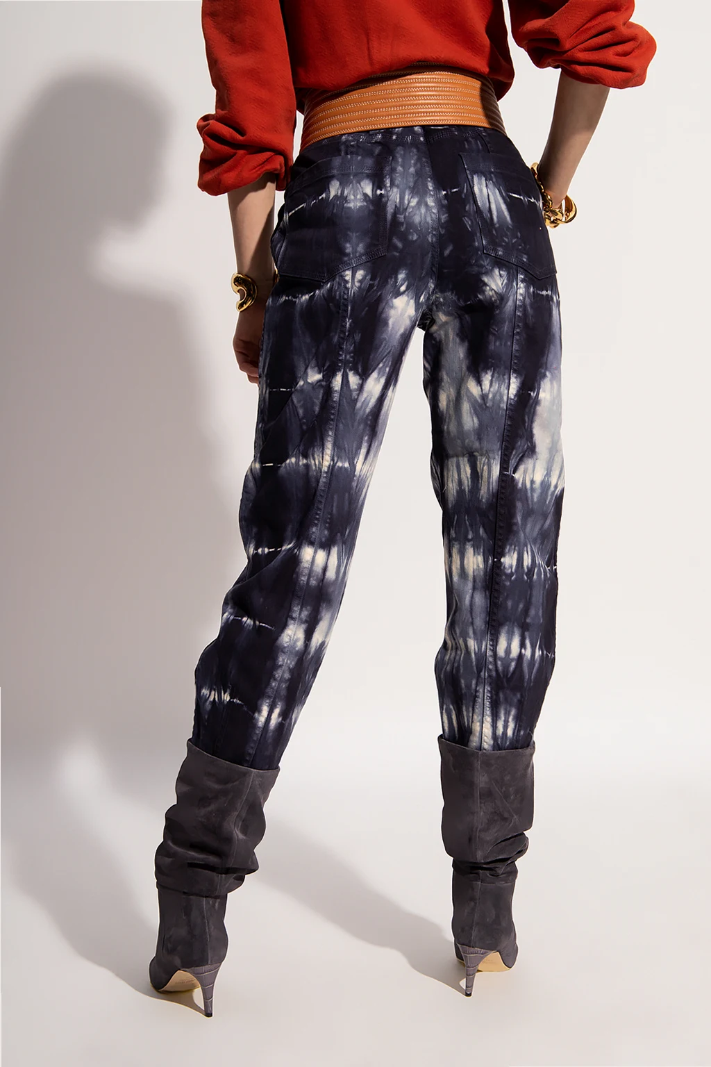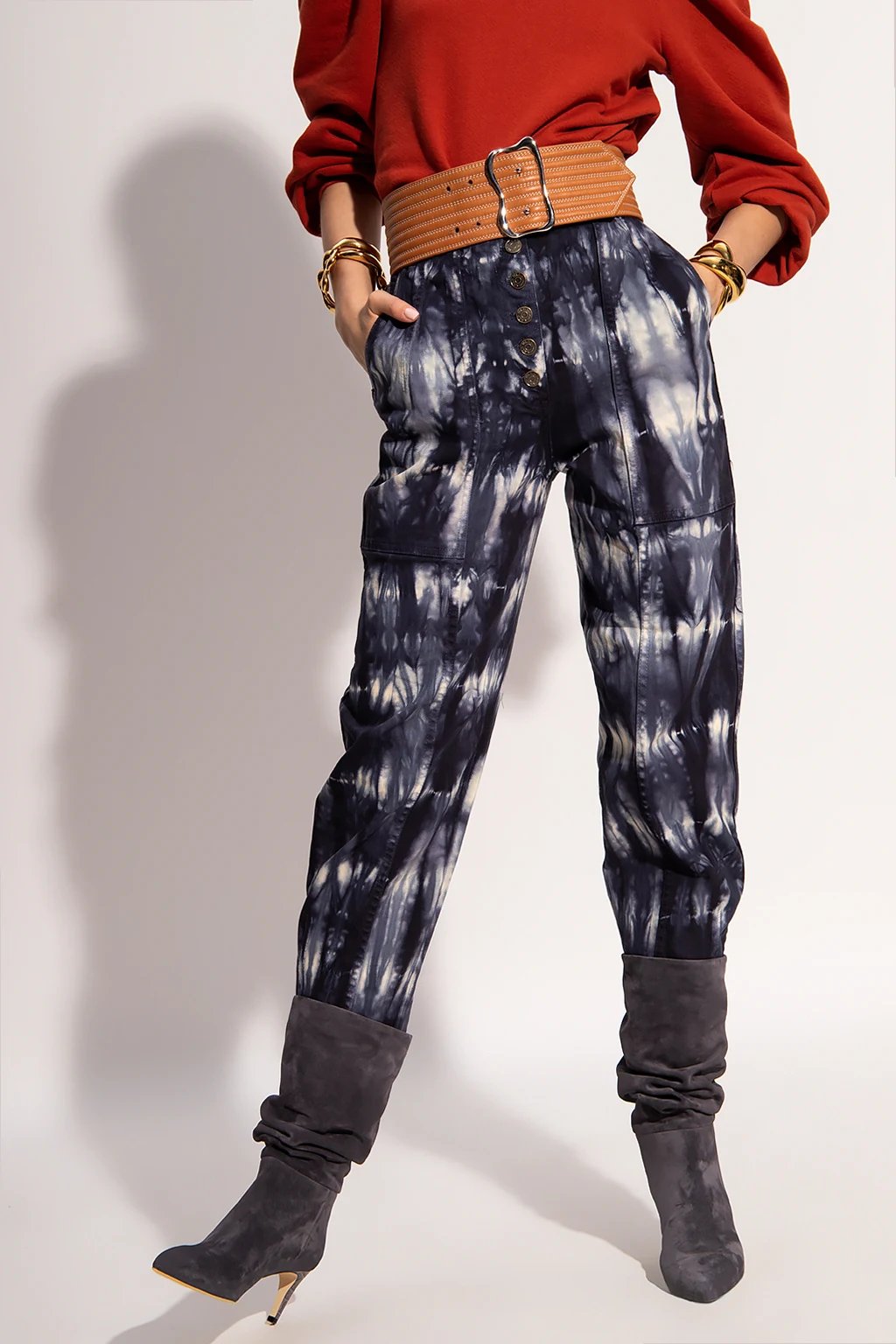 Navy blue and white 'Apollo' high-waisted jeans from Ulla Johnson. Boasting an all-over pattern, this pair features button fastenings, a waist-cinching belt, four slip pockets and turn-up cuffs.