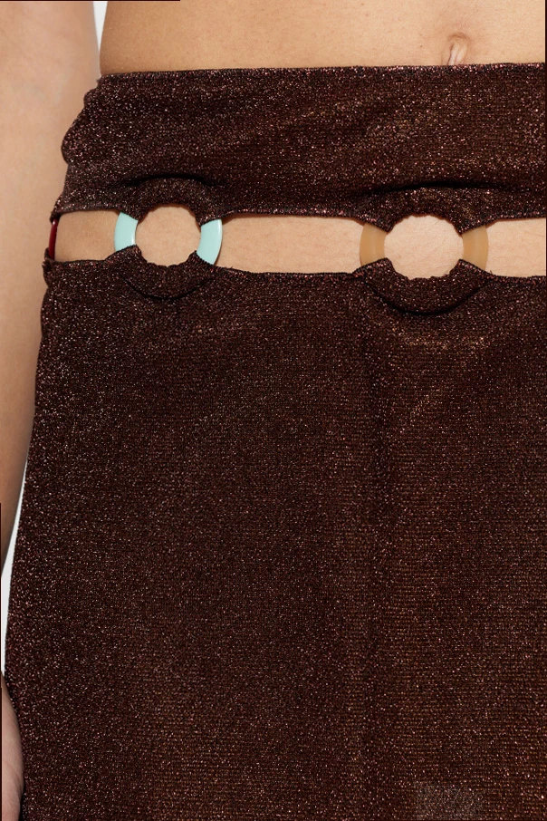 Die einheitliche Stoffstruktur, verziert mit Lurex-Faden , zieht mit ihrem Stil und einzigartigen Schimmer alle Blicke auf sich. Besonderes Augenmerk verdient der effektvolle Taillenausschnitt, der mit einem filigranen, durchbrochenen Motiv aus farbigen Ringen gestaltet ist und einen modernen, einzigartigen Akzent setzt. Der Verzicht auf zusätzliche Verzierungen oder Prints unterstreicht die höchste Materialqualität und die Sorgfalt der Verarbeitung.