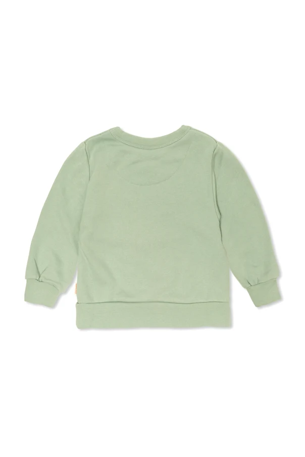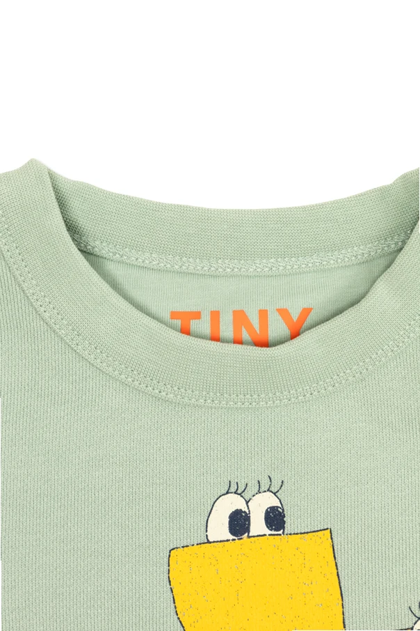 Sweatshirt mit Print der Marke Tiny Cottons, gehalten in einem zarten Mintton, besticht durch ihren klassischen Schnitt und ein raffiniertes Design. Das Modell zeichnet sich durch eine schlichte Form mit breitem, geripptem Abschluss am runden Ausschnitt sowie sorgfältig gearbeiteten Bündchen aus. Ein auffälliger, grafischer Print mit gelb-orangefarbenen Schuhen mit Augen und dem humorvollen Schriftzug „TINY“ fügt sich harmonisch in den freundlichen, comicartigen Stil ein, der bei jungen Modeentdecker*innen so beliebt ist.