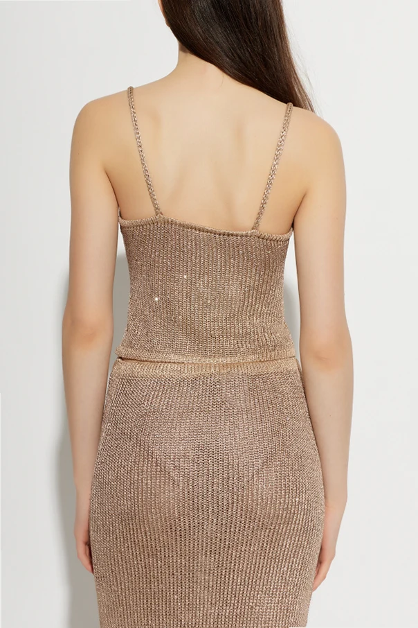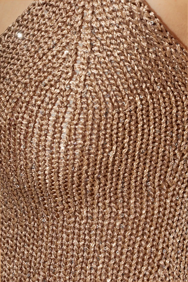 Das Material aus Seide in goldenem Ton fasziniert mit einem metallisierten Glanz, ergänzt durch eine ausgeprägte Strickstruktur sowie kunstvoll eingearbeitete Pailletten und glänzende Fäden. Das eindrucksvolle Mesh hebt das luxuriöse Flair des Stoffes hervor, ohne das Styling durch zusätzliche Logos oder Prints zu überladen. Das Top besticht durch seine Leichtigkeit und die außergewöhnliche Weichheit des Materials.