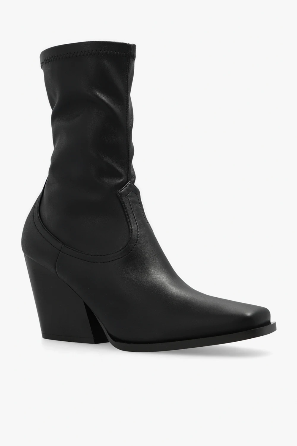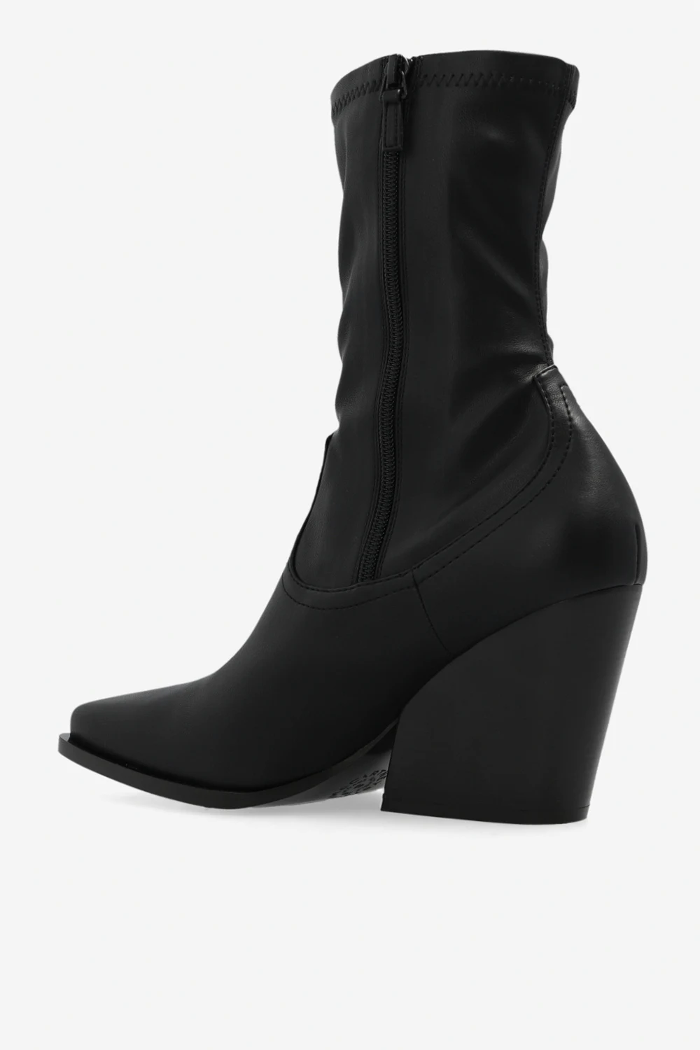 Black ‘Cowboy’ heeled ankle boots from Stella McCartney. Crafted from faux leather with a square toe, this model sits on a black rubber sole and features a zip fastening and an asymmetrical heel.