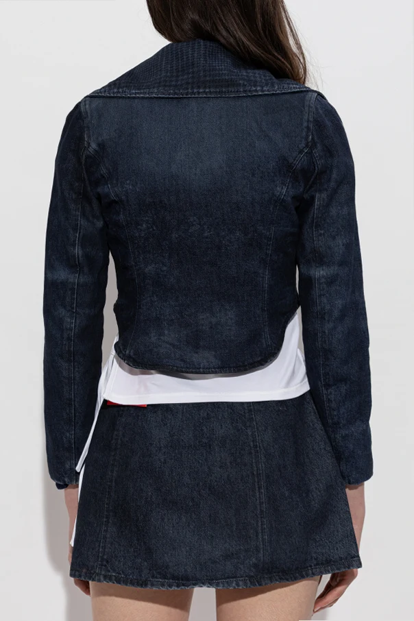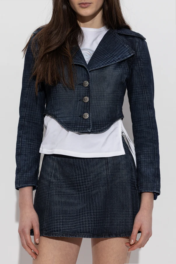 Kurze Jeansjacke „DE-ALI-S” der Marke Diesel besticht durch ihre raffinierte Form und sorgfältige Verarbeitung. Der dunkelblaue Denim mit sichtbarer, subtil melierter Webstruktur schmiegt sich sanft an die Silhouette an und betont ihre Vorzüge. Der elegante, deutlich kurze Schnitt hebt die Taillenlinie hervor, während der breite, effektvoll akzentuierte Retro-Kragen einen Hauch künstlerischer Nonchalance verleiht.