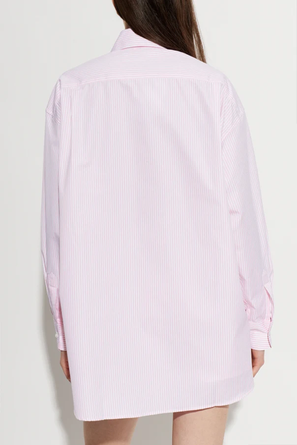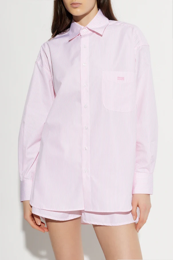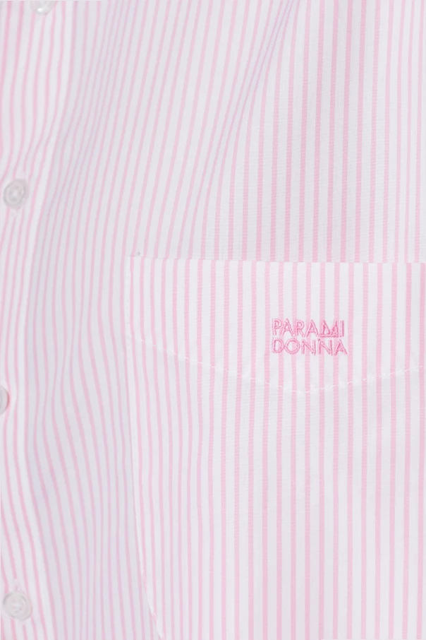 Das Gesamtbild wird durch einen klassischen Kragen , breite Manschetten sowie eine aufgesetzte Brusttasche ergänzt, die mit einem dezenten Logo in Rosétönen veredelt ist. Die minimalistische Form, sorgfältig ausgearbeitete Details und helle, dekorative Knöpfe unterstreichen den luxuriösen Charakter dieses Modells.
