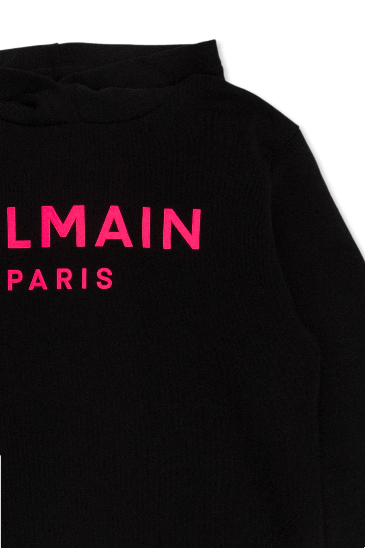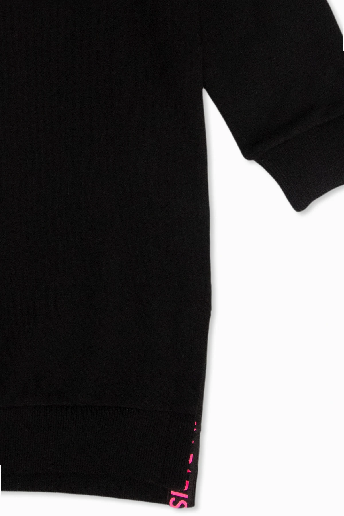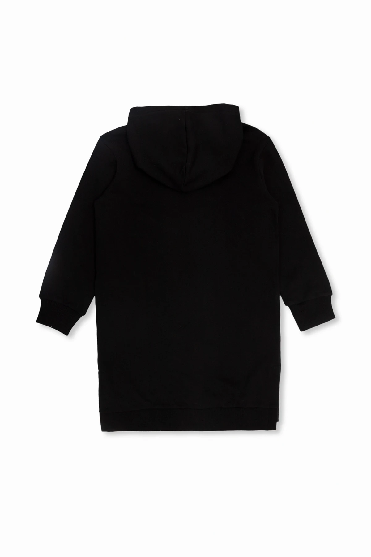 Black hoodie dress from Balmain Kids. Made of cotton, this pair features a neon yellow logo print, side vents with contrasting prints and ribbed cuffs.