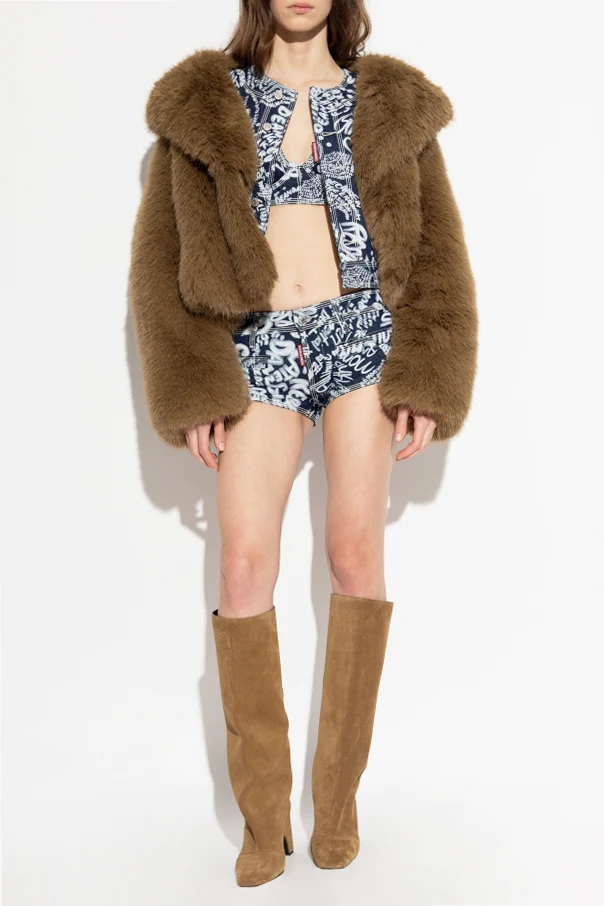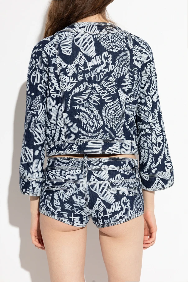 Jeansjacke mit Print von DSQUARED2 ist eine markante Verbindung von Exklusivität und moderner Ausdruckskraft. Ihr kastiger, leicht verkürzter Schnitt harmoniert perfekt mit dem dynamischen Print – weiße, künstlerische Schriftzüge und Motive auf marineblauem Denim schaffen eine einzigartige Komposition.