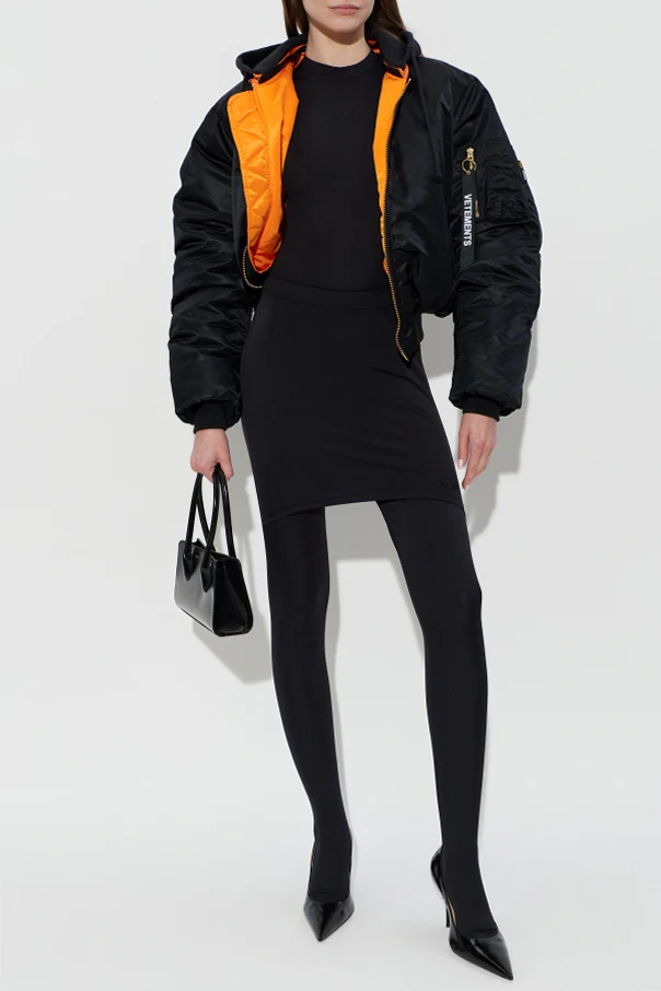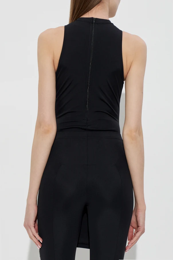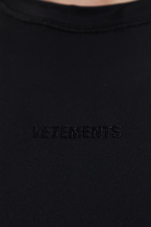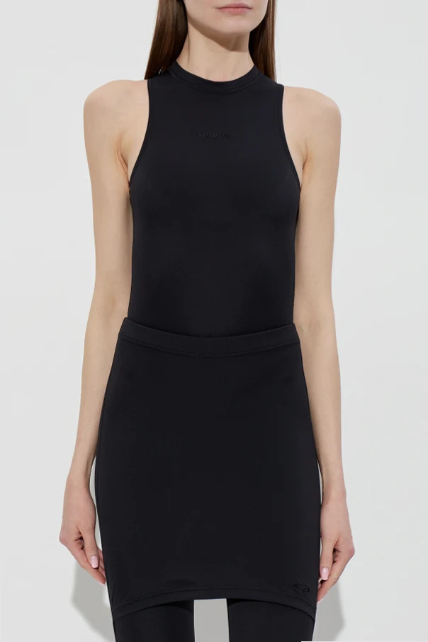 Body mit aufgenähtem Logo der Marke VETEMENTS ist die Quintessenz moderner Eleganz in minimalistischem Stil. Die präzise, ärmellose Schnittführung, betont durch einen dezenten Stehkragen und die perfekte Anordnung der sichtbaren Nähte, macht dieses Modell zu einem besonders raffinierten Bestandteil der Garderobe. Der Reißverschluss am Rücken verleiht der Form zusätzliche Funktionalität und Leichtigkeit.