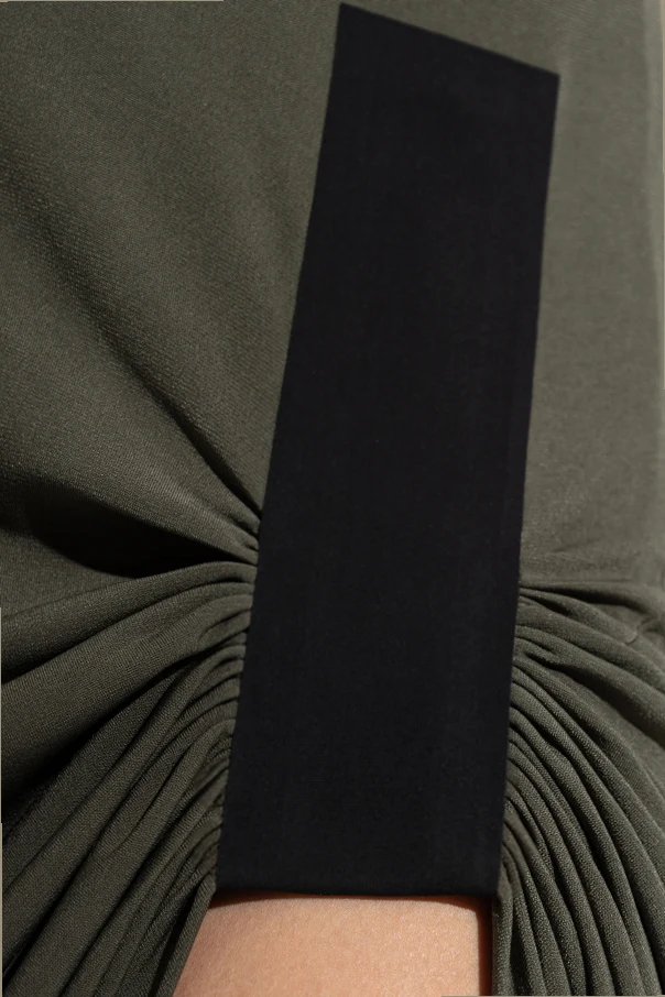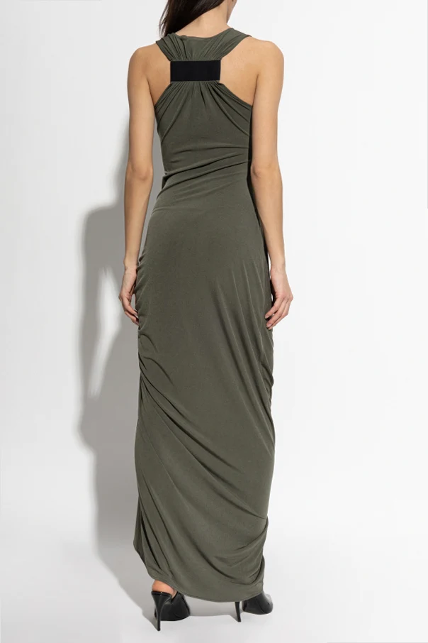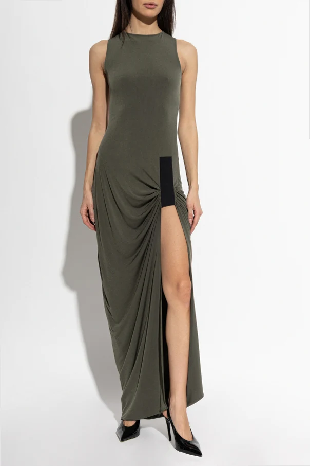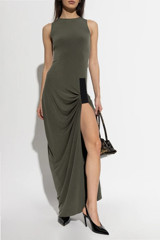 Ärmelloses Kleid von Coperni ist die Quintessenz zeitgenössischer Eleganz in einer avantgardistischen Ausführung. Die lange, grüne Silhouette des Designs betont harmonisch die Figur, während breite Träger und ein klassischer, abgerundeter Ausschnitt eine subtile Noblesse verleihen. Die wilde Ausstrahlung des Kleides entsteht durch das verlängerte, asymmetrische Drapieren an der Seite und den kühnen Schlitz, der das Bein ins Rampenlicht stellt.