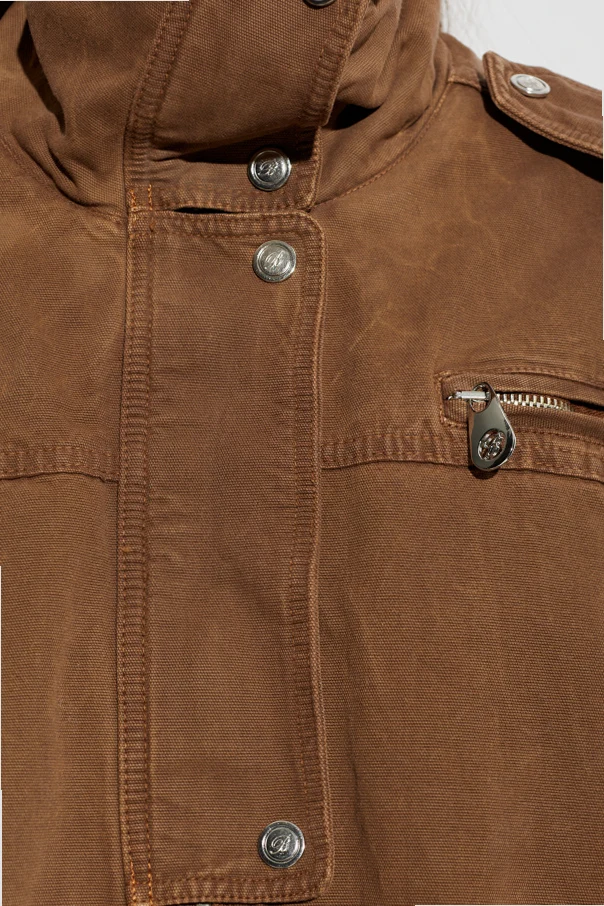 Die Baumwolljacke mit Schulterklappen der Marke Blumarine ist ein Ausdruck zeitloser Eleganz, inspiriert von militärischer Ästhetik. Sie zeichnet sich durch einen braunen Farbton aus, der durch eine markante, leicht cordartige Struktur verstärkt wird, die sich durch ihre Weichheit und luxuriöse Verarbeitung auszeichnet. Der sorgfältig gearbeitete, leicht oversized Schnitt reicht bis zur Hüfte und wird durch einen breiten Stoffgürtel mit großer Metallschnalle betont, der die feminine Silhouette dezent unterstreicht.