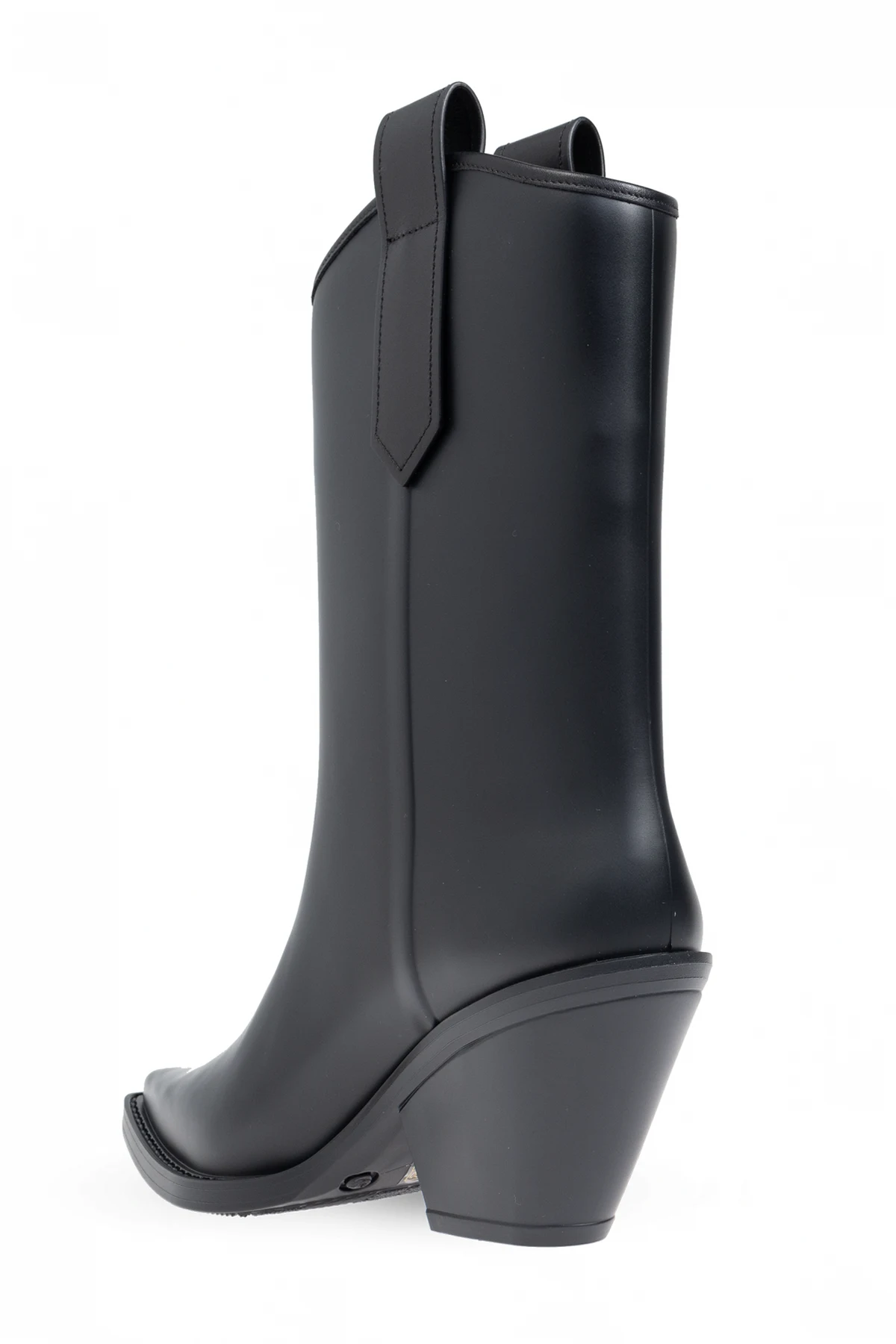 An der Seite des mittelhohen Schafts befindet sich das goldene Logo des Designers, eingebettet in einen eleganten Schild, was ein klares Symbol für Exklusivität und Zugehörigkeit zur Welt der High Fashion darstellt. Der charakteristisch schräge und mittelhohe Absatz der Schuhe, zusammen mit der leicht hochgezogenen Front, unterstreicht den authentischen Cowboy-Stil und bietet gleichzeitig täglichen Tragekomfort.