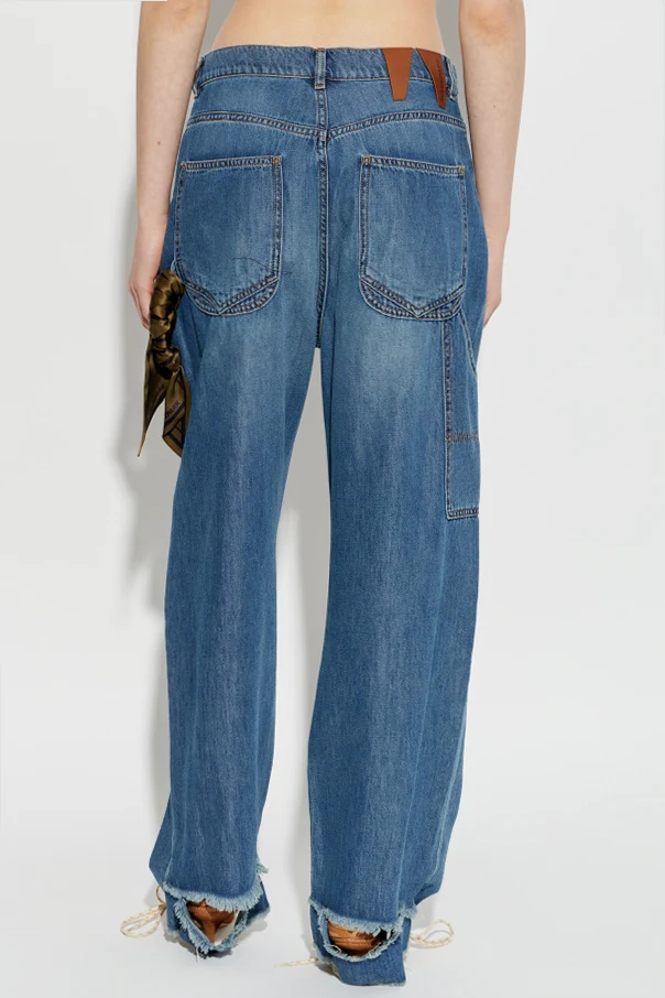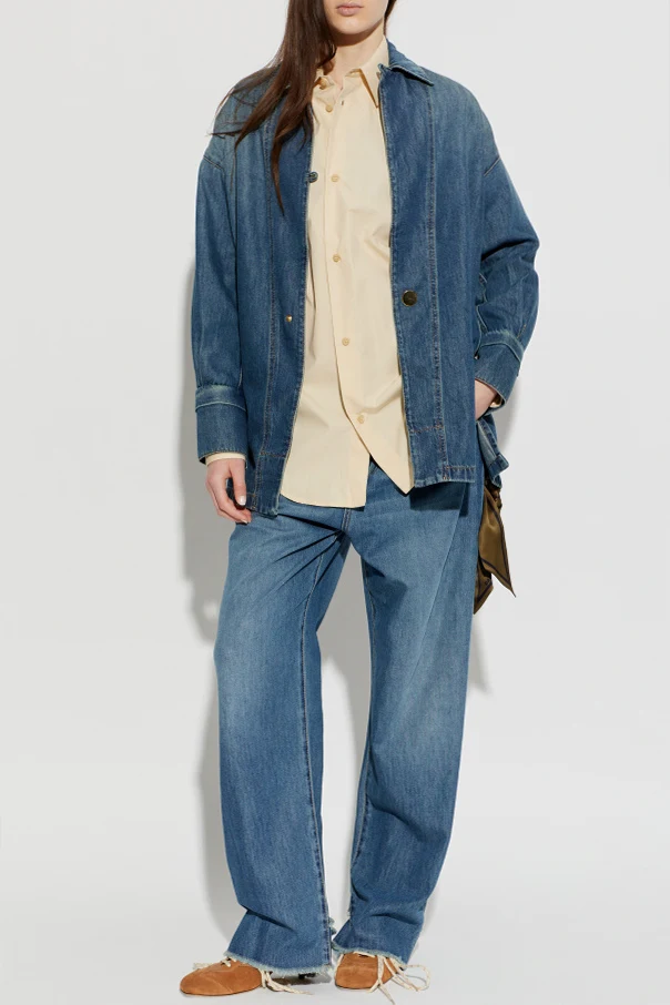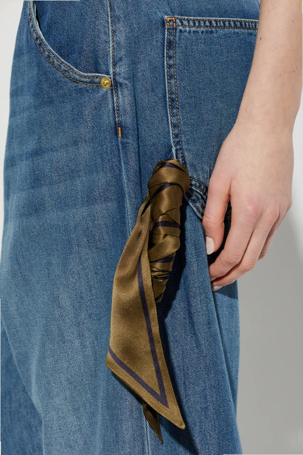 Der gerade, reguläre Schnitt mit weiter geschnittenen Beinen und die roh belassenen Beinabschlüsse mit einem leichten Fransen-Effekt verleihen der Silhouette Freiheit und zeitlose Eleganz. Zwei Taschen vorne und zwei großzügige Taschen hinten sind mit kontrastierenden Nähten verziert, während der goldfarbene Knopf und die Nieten einen schönen Akzent zum blauen Denim setzen. Ein einzigartiges Detail ist das diskret an der rechten Tasche angenähte Seidentuch.