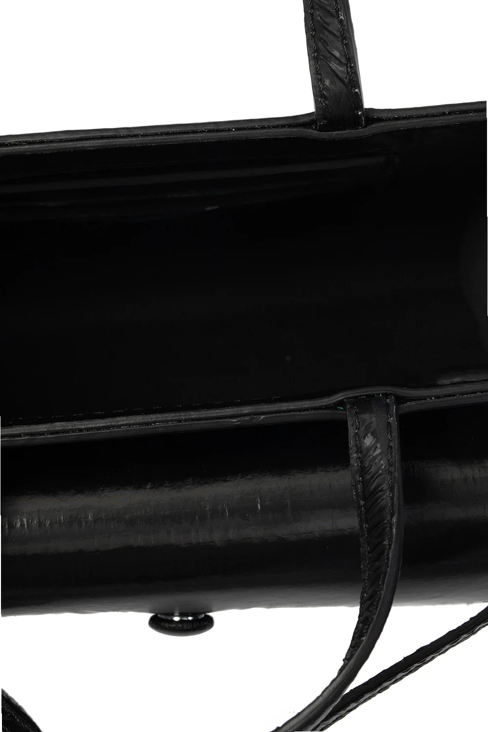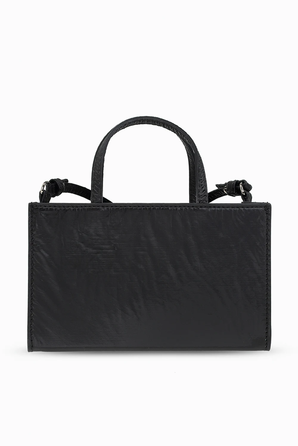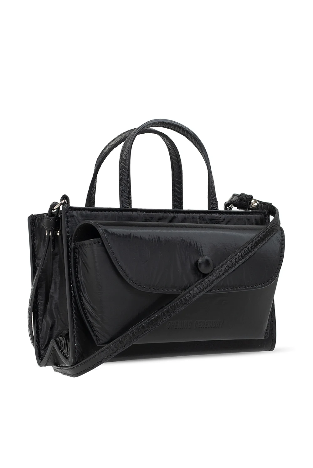 Black shoulder bag from Opening Ceremony. This model features an eyewear pocket with a magnetic snap and embossed logo, as well as two half-round handles, detachable strap, silver-tone metal hardware and one internal compartment with three card slots.
